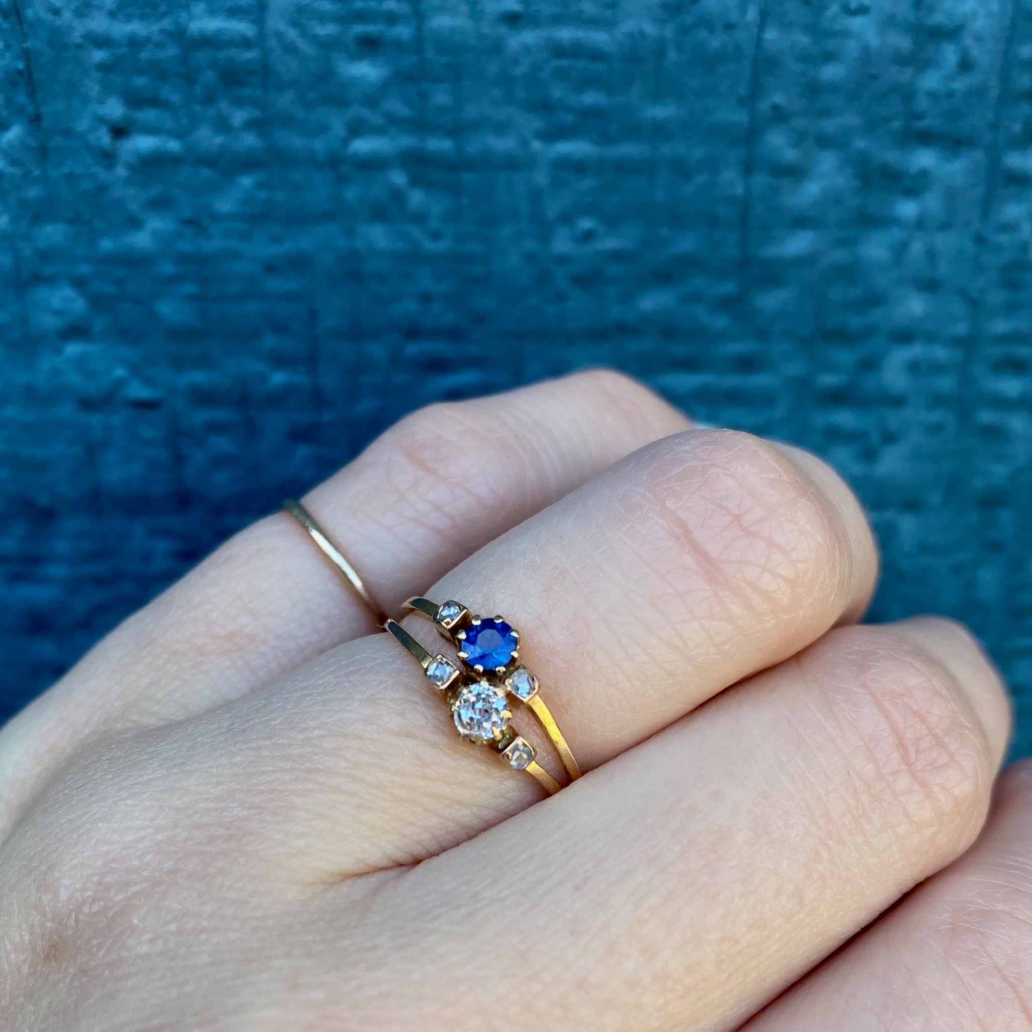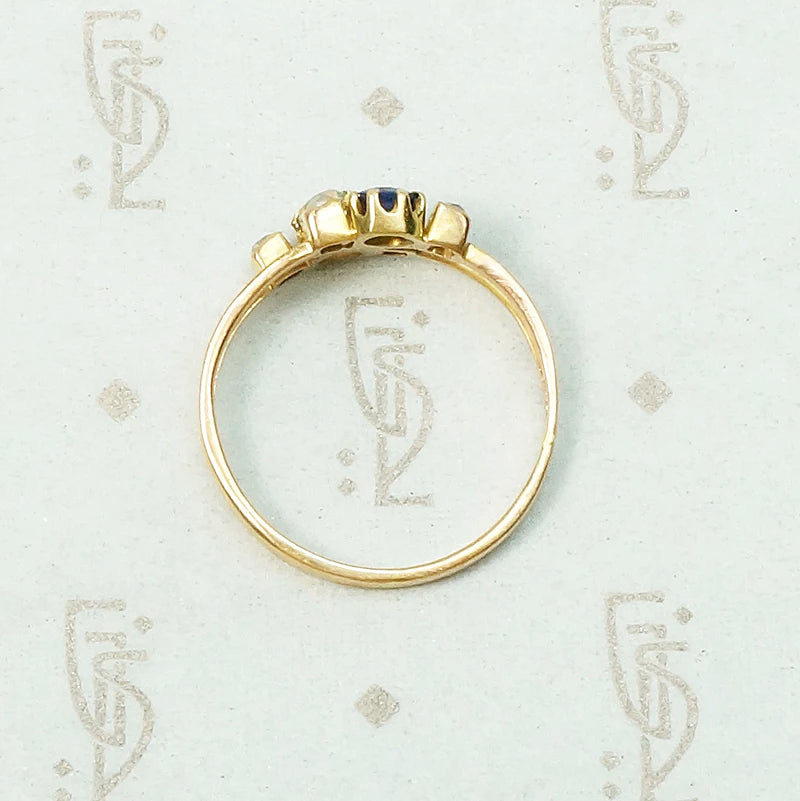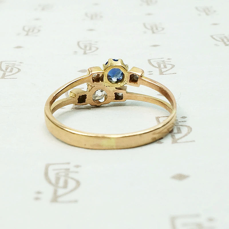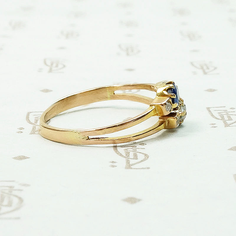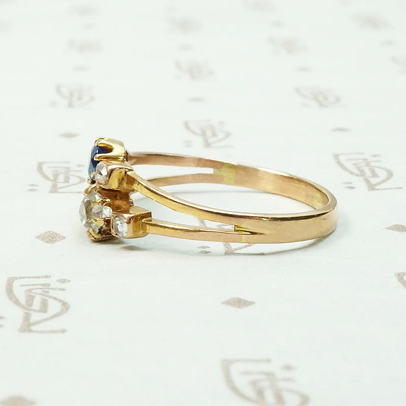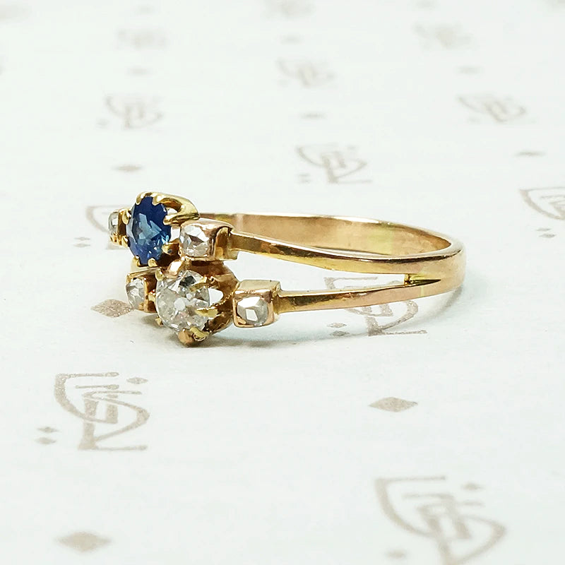 The crossover style of ring is also called the Toi et Moi, which means "you and me" in French. This particular ring is quite an unusual version of the style. Two bands of 14k rose and yellow gold nestle together. One is set with a 0.15ct sapphire and the other is set with a 0.15ct old mine cut diamond. Each of the gems are flanked by two rose cut diamonds. The omc and the sapphire are claw set and the rose cuts are set in tiny gold squares. The bands curve and mold together creating a single ring, the way love molds two spirits into one. The romantic symbolism of the Toi et Moi ring makes this a lovely choice for an engagement ring. Circa 1910.