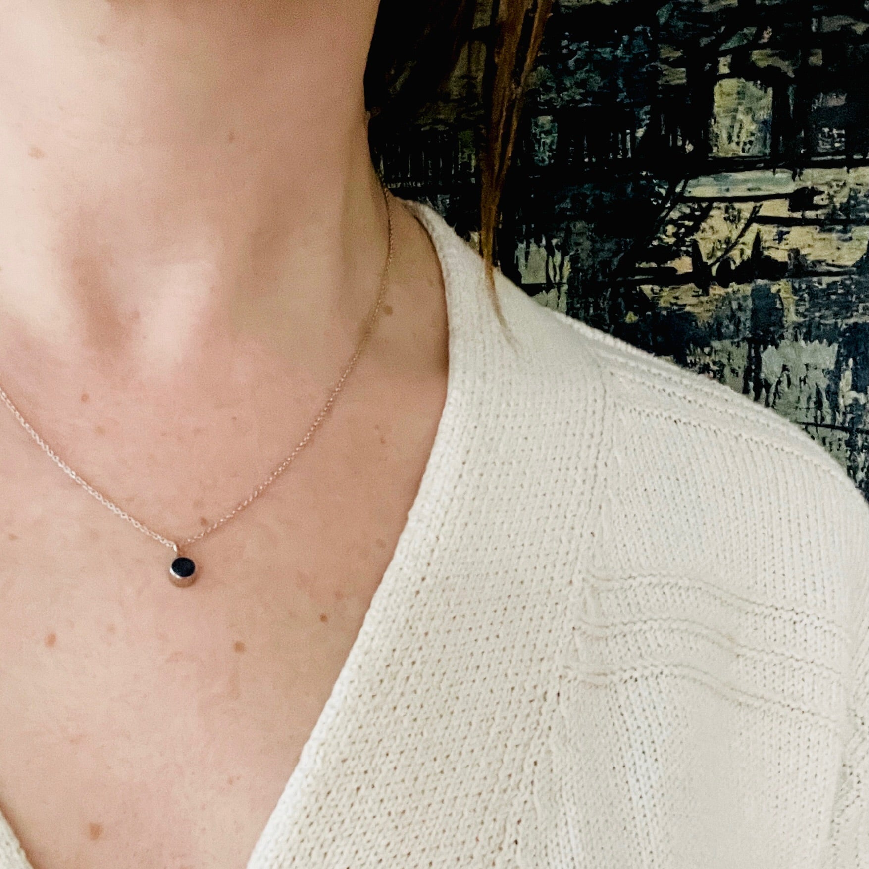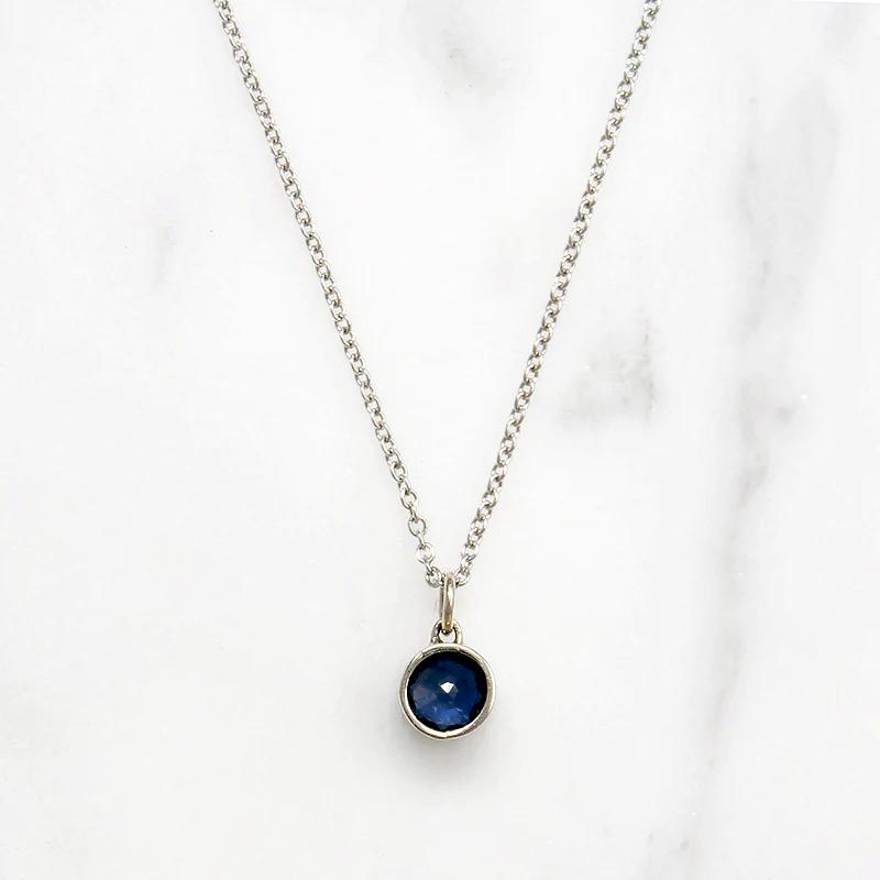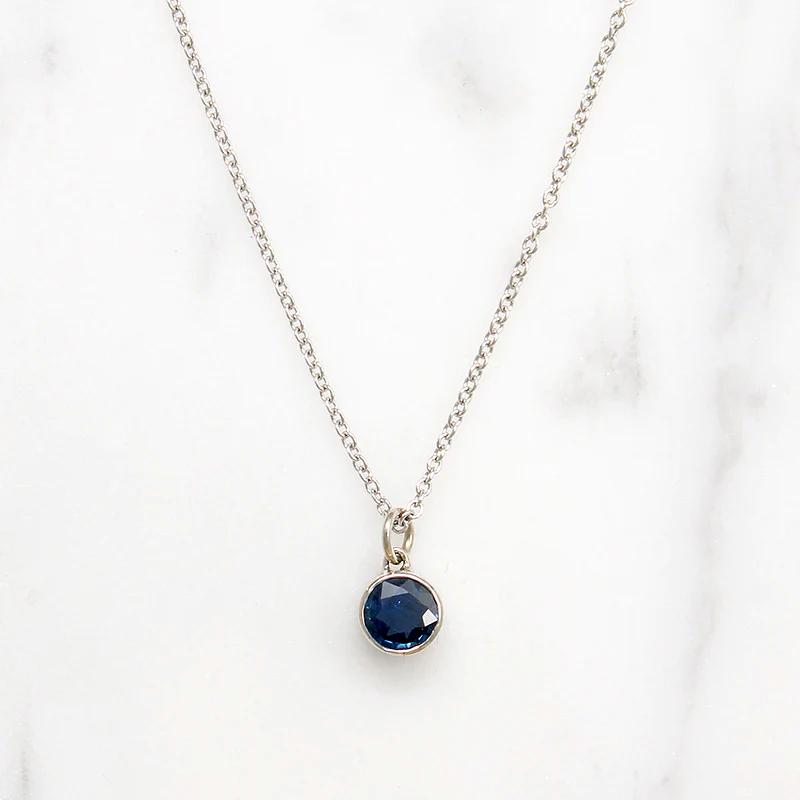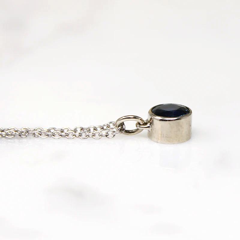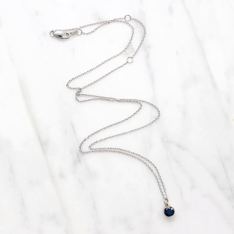 This elegant solitaire pendant is set with a velvety-blue sapphire. The vintage sapphire is 0.51ct of vibrant, natural beauty. The gem is displayed in a sleek 14k white gold bezel with a jump ring added to its bale. The adjustable 14k white gold cable chain finishes with a sturdy lobster claw clasp. A classic necklace perfect for daily wear.