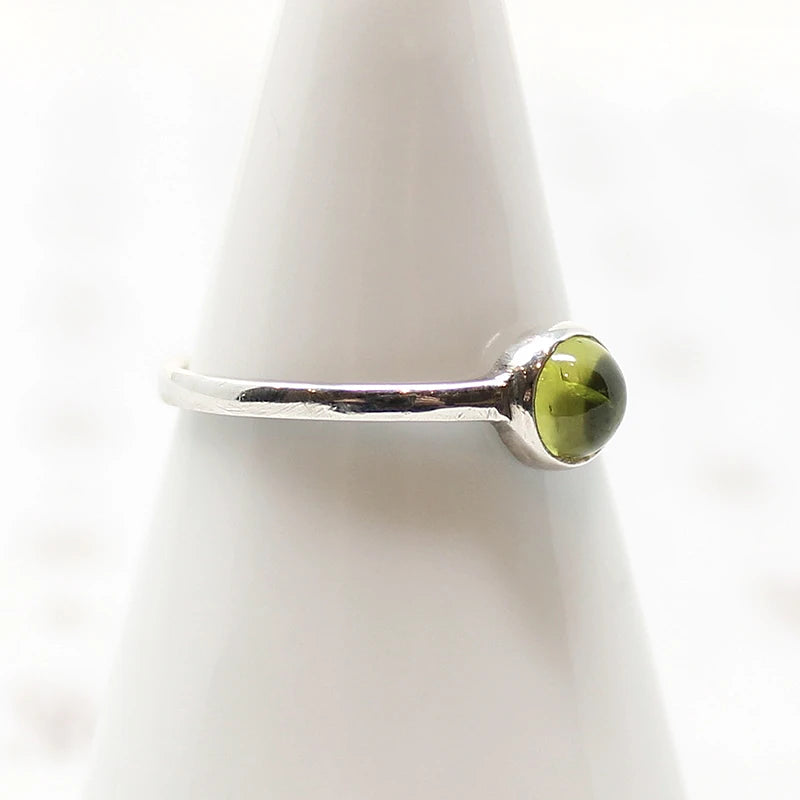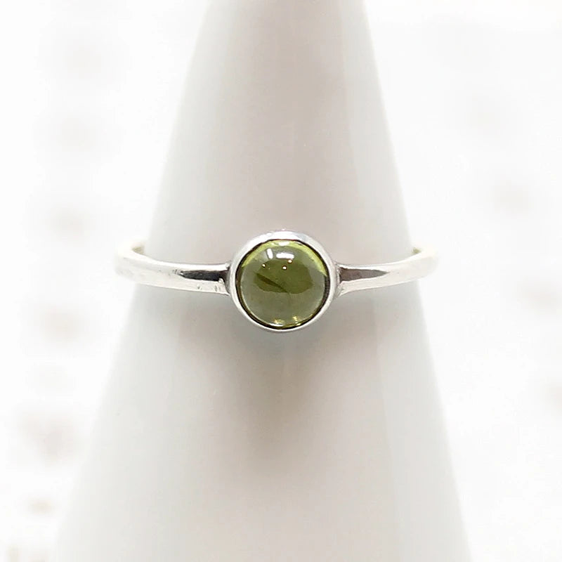 A verdant cabochon of vintage peridot is simply bezel set in recycled sterling silver. Peridot, August's birthstone, is associated with harmony, good health, restful sleep, and peacefulness.