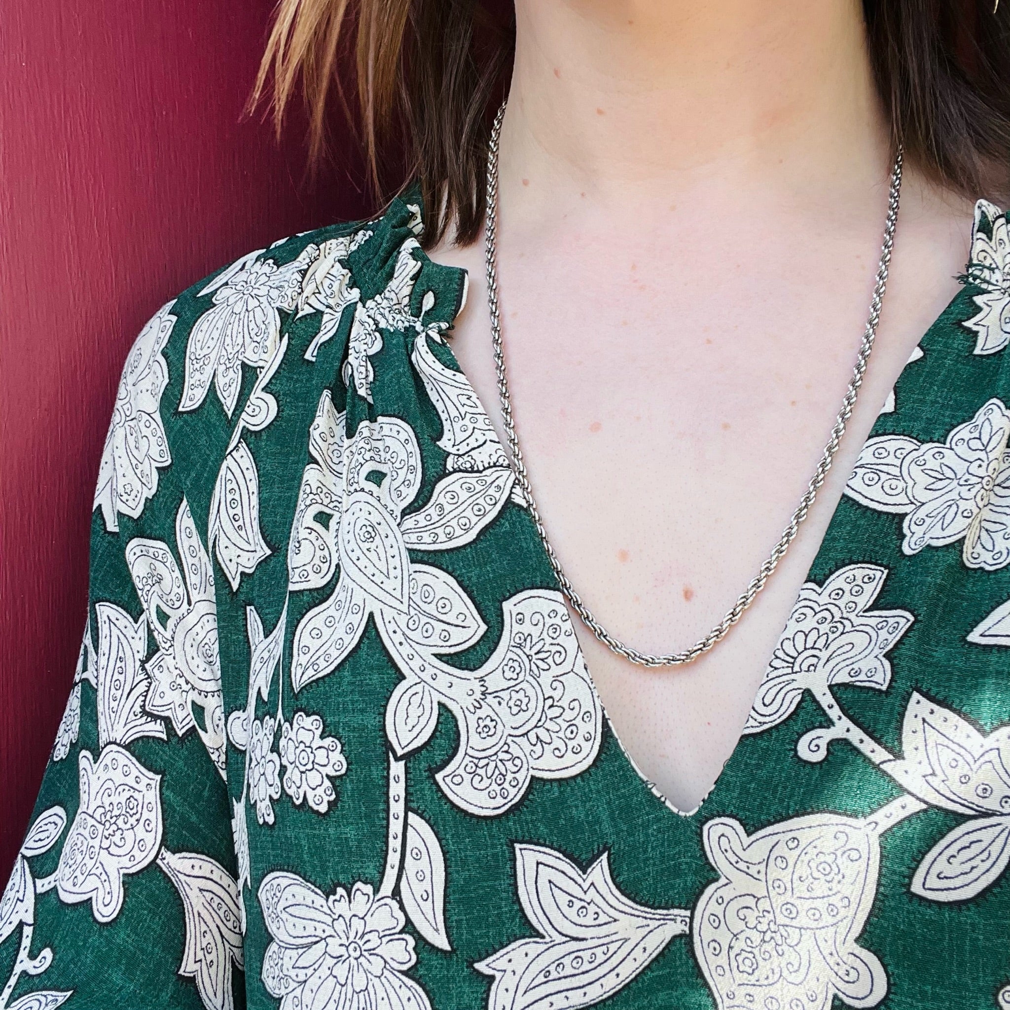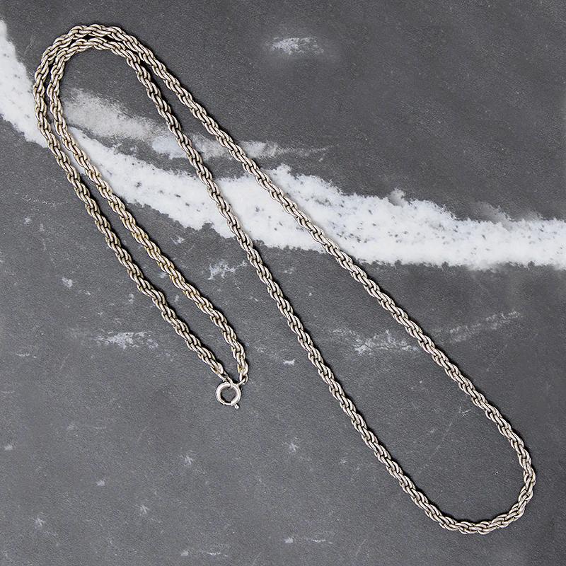 This sterling silver twisted rope chain will become your new go-to accessory. So versatile, it is perfect worn alone, with a pendant, or layered with other necklaces. Circa 1950.