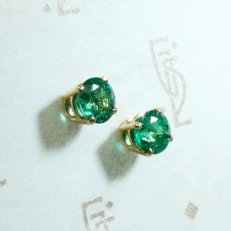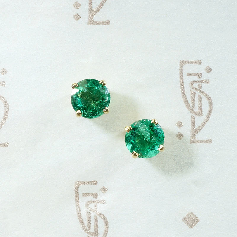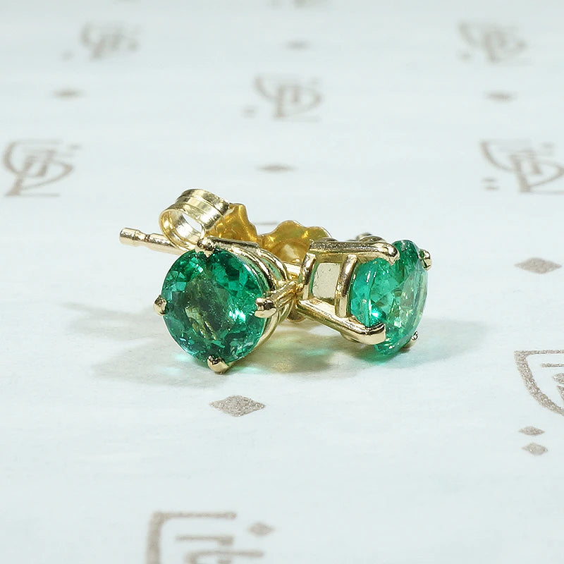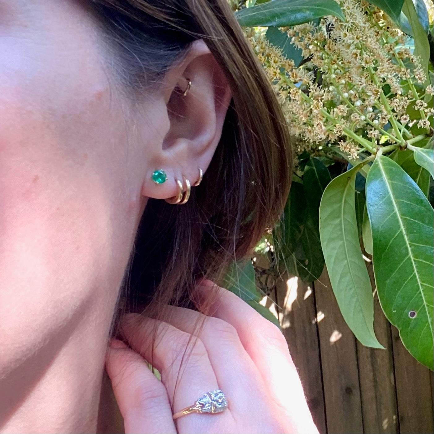 Vibrant green emeralds are set in 14k yellow gold basket settings. The round faceted 0.77tcw emeralds are vintage and the gold of the settings is recycled. Vivid green, like Oregon in the spring time. A perfect gift for your favorite May baby.