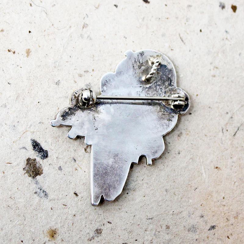 A vibrant, vivacious, wild parrot brooch is depicted in lovely Zuni inlay. He gazes out at you from his clever little eye. Red coral, mother of pearl, turquoise, agate, and onyx are inlaid in sterling silver. He sits upon a backdrop of silver beaded foliage. The brooch has both a pin and a bale, so it may also be worn as a pendant. The pin is unsigned but research suggests he may be the work of artist Loretta Martza. Circa 1980.