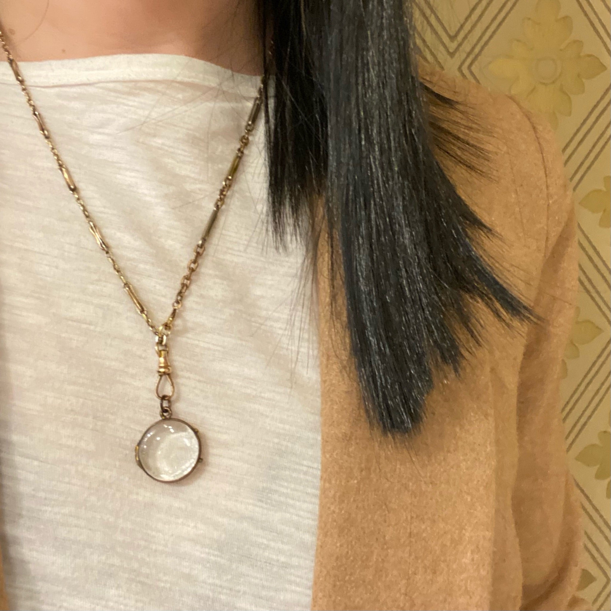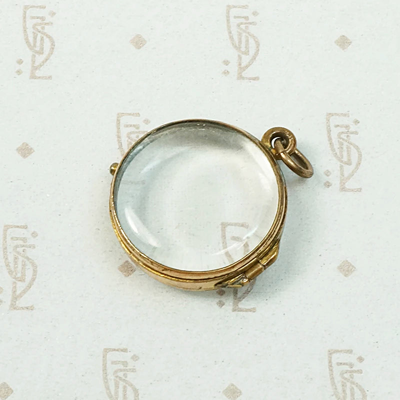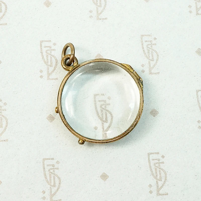 This lovely Victorian locket has crystal on both sides so whatever you choose to save in it will be displayed from two angles. Perfect for a picture, a lock of hair, a butterfly wing or a special flower. The crystal is clasped in a gold filled hinged frame with a secure closure. A jump ring has been added, making it easy to wear on one of our Ancient Influences married chains. Circa 1880.