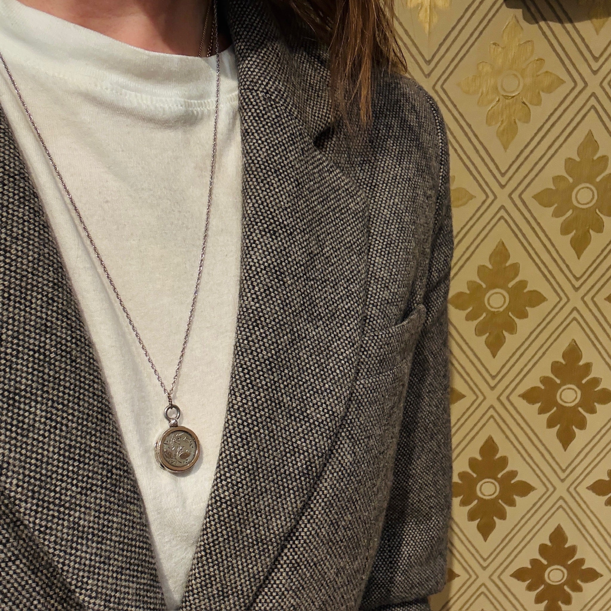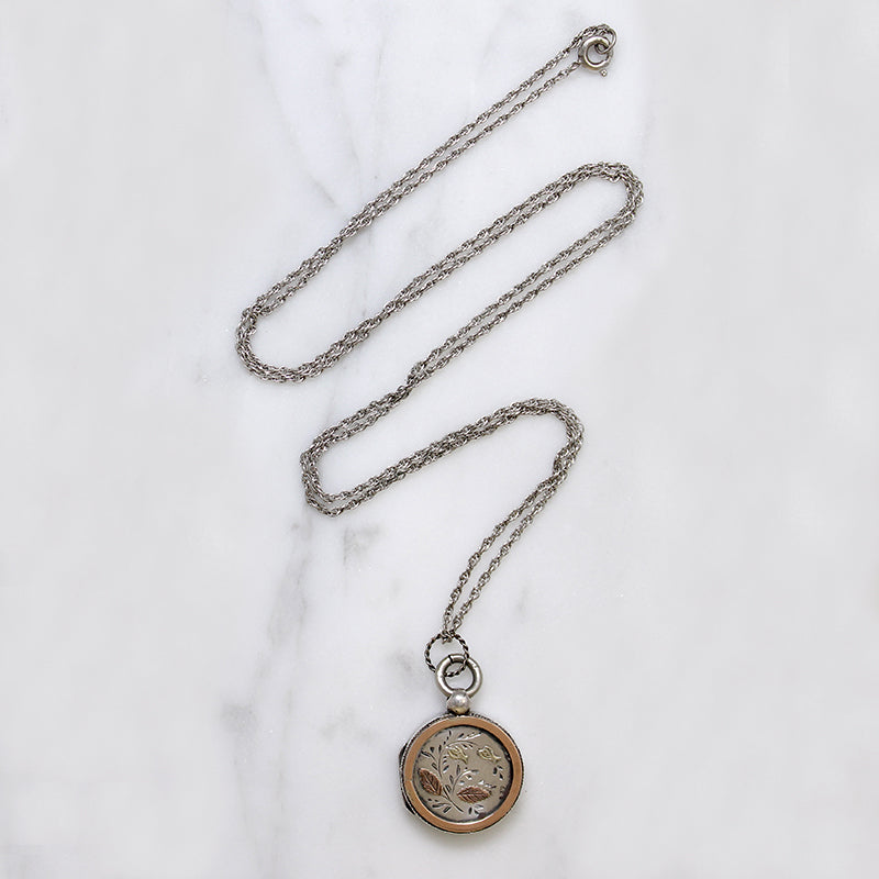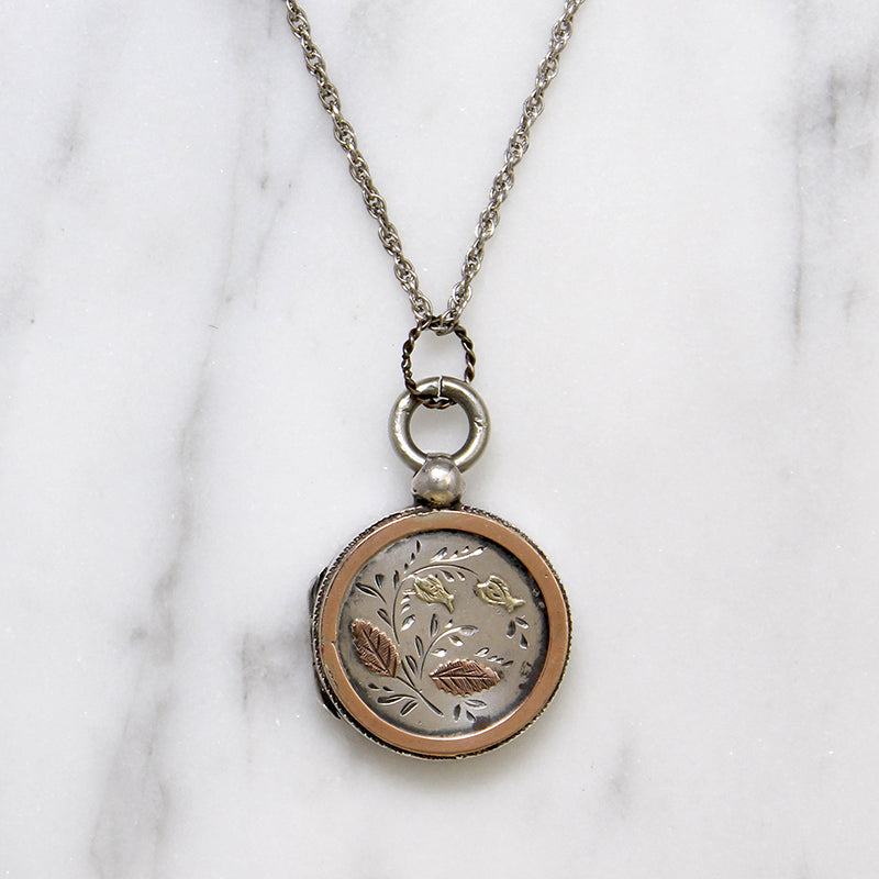 This sterling silver locket has lovely Victorian details. The round, flat locket is engraved on the front with leafy flowers. Yellow and rose gold has been applied to bring the scene to life. This locket has no frames or glass; the interior is clean with blue paper, and the clasp is secure. A twisted wire jump ring has been added to the bale, and it hangs from a sterling silver rope chain. A romantic gift, perfect for preserving pictures of your loved ones. Circa 1890.