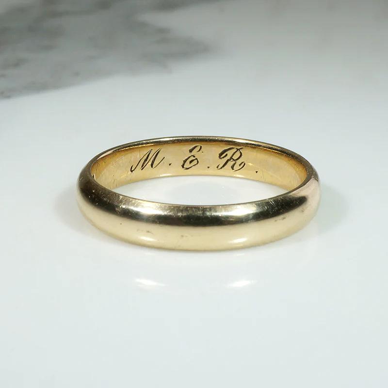 A Victorian 14k gold wedding band with a shallow half round exterior and a very subtly curved interior. It has a pleasant smooth feel on the finger. The interior of the band bears the maker's mark "B.N.Co14K" and is hand engraved with the monogram "M.E.R." Circa 1890.