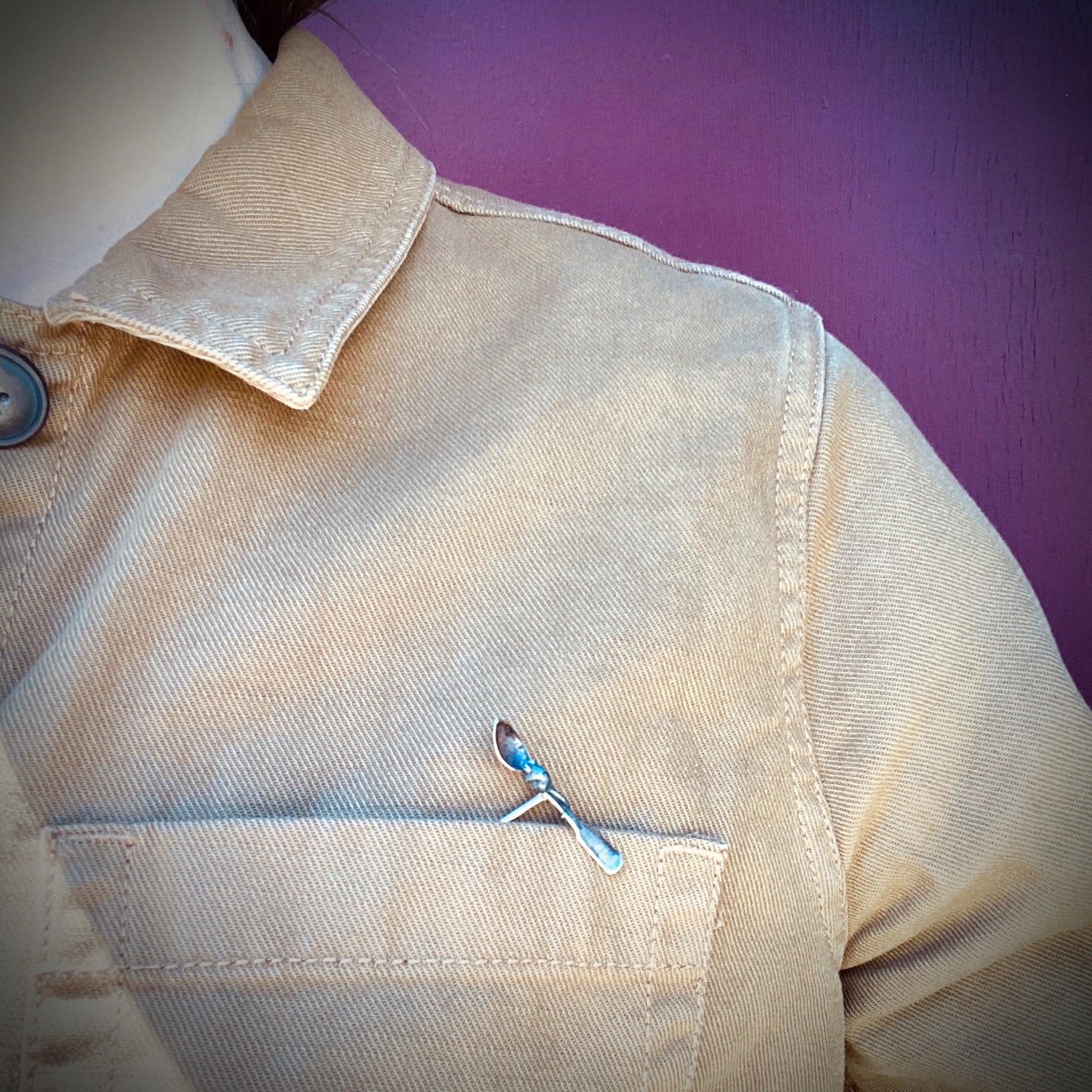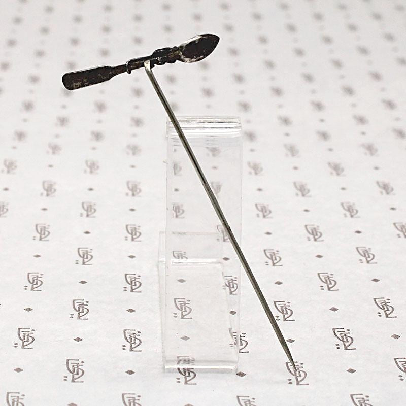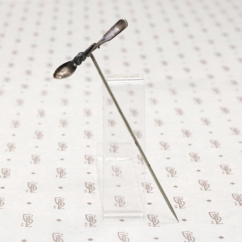 Adorable Victorian mouse jewelry, this silver stick pin is an example of that popular and charming fashion. A tiny mouse climbs up a little silver spoon. His wee tail is just everything. Stick pins are equally fabulous worn on your lapel or scarf. Circa 1880.