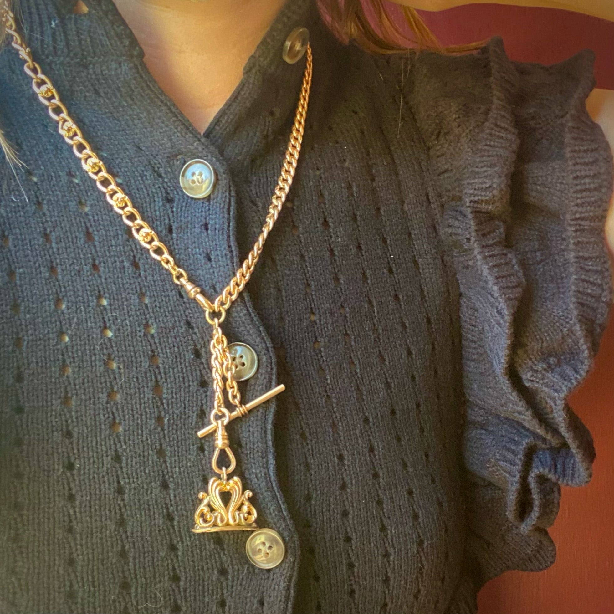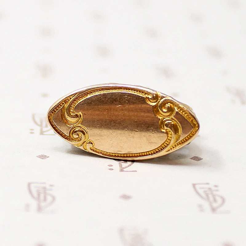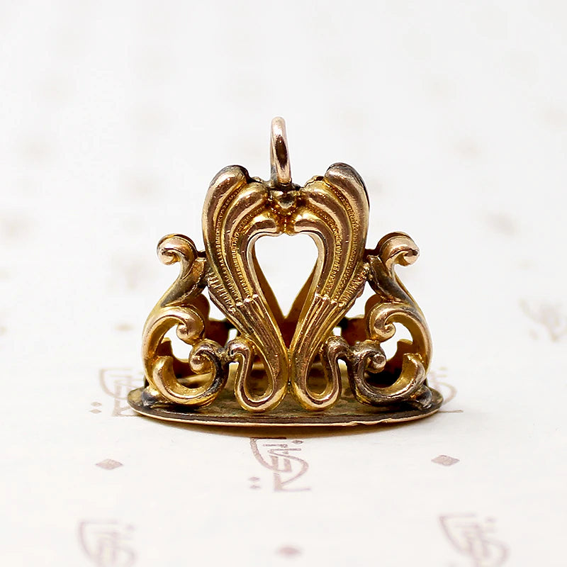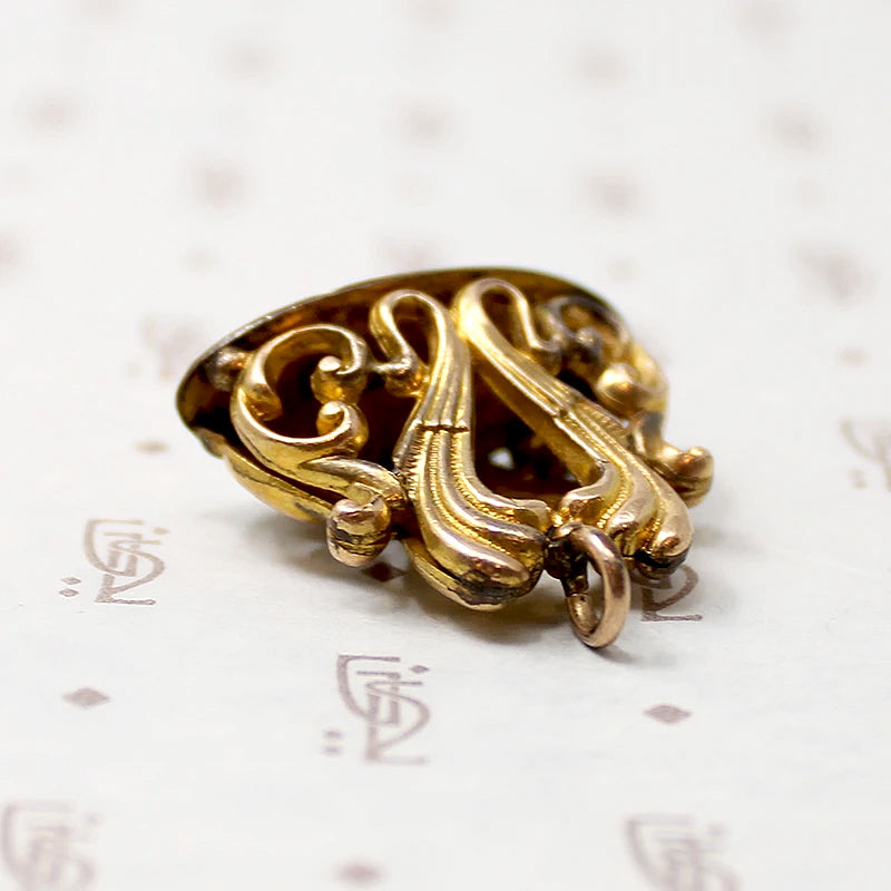 This Victorian Revival gold filled fob looks luxurious, with its rich gold color and curling acanthus leaves. The uncarved bottom of the fob is edged with a curling engraved design. Wear this fob on one of our lovely Ancient Influences married chains for a touch of affordable elegance. Circa 1940.