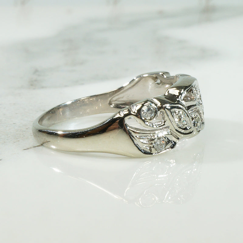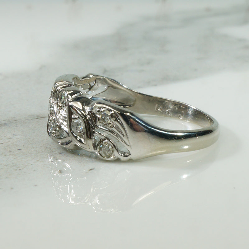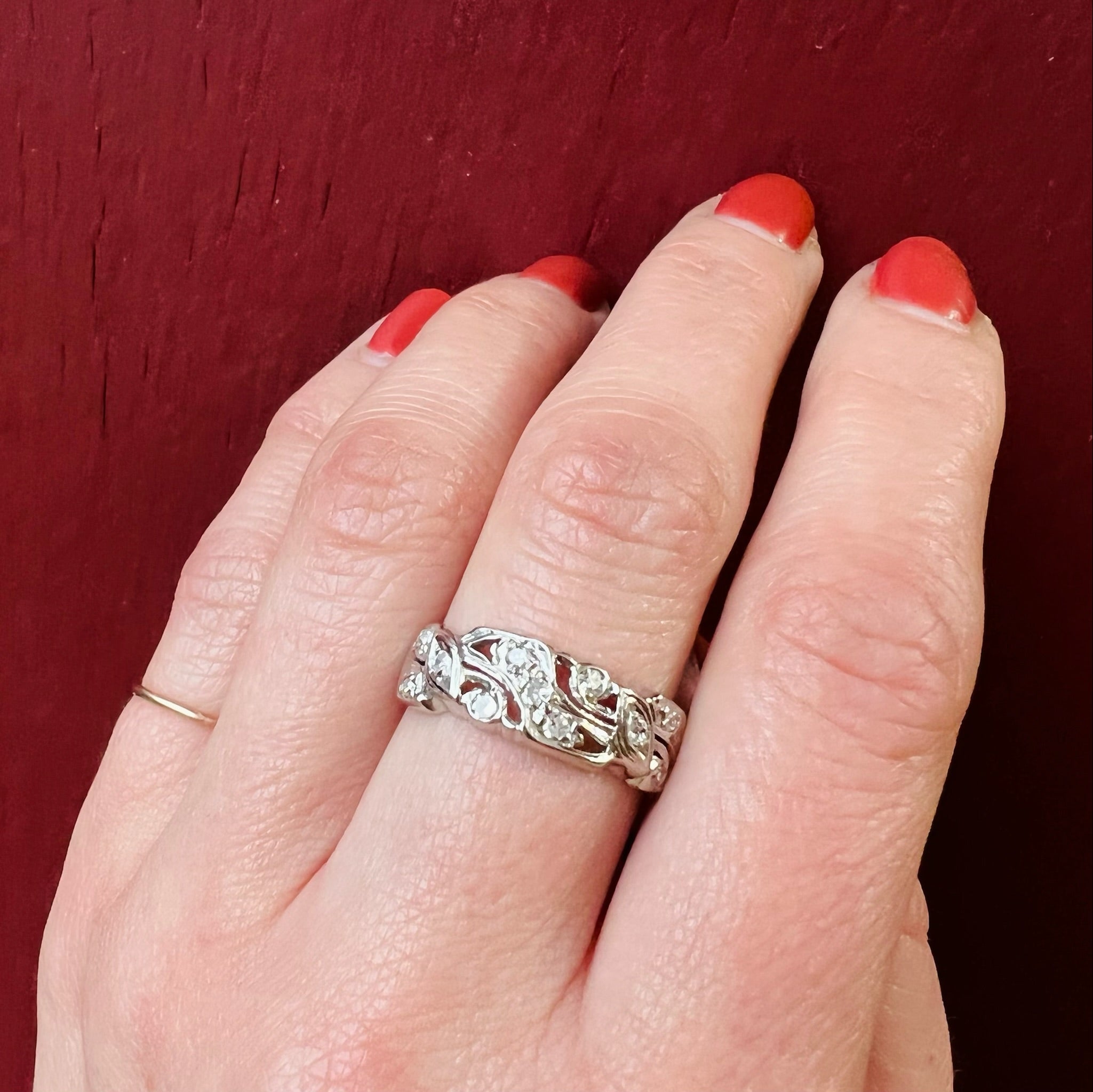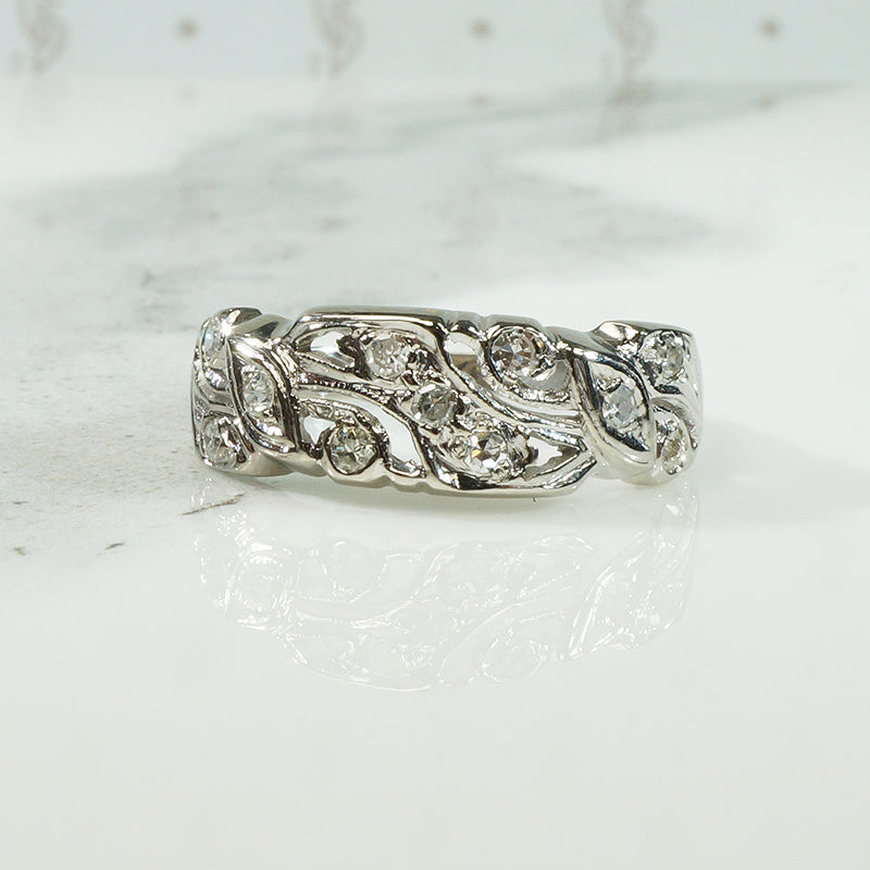 Twining White Gold leaves and vines cover the front of this pretty wide band and are scattered with white and sparkling diamonds. Old euro, brilliant, and old mine cut diamonds are represented in this ring like a visual history of diamond cuts. The ring is 14k white gold Circa 1940 with diamonds spanning 1880 to 1940.