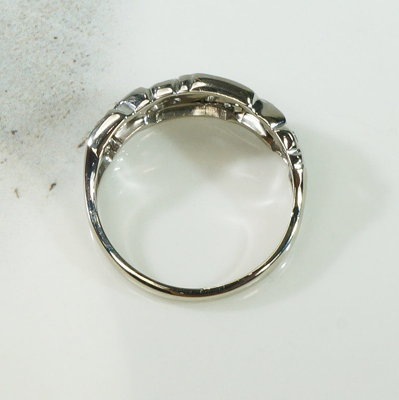 Details.....Currently a size 8.5. This ring may be sized up or down two sizes free of charge. Please contact us if you need this ring sized more than two sizes, it may be possible and will have a small fee. The top of the ring is 7.2mm wide and tapers back to 2.4mm at the back of the band. In Very Good Vintage Condition. You should always expect some wear on vintage and antique jewels, we consider it part of the charm.