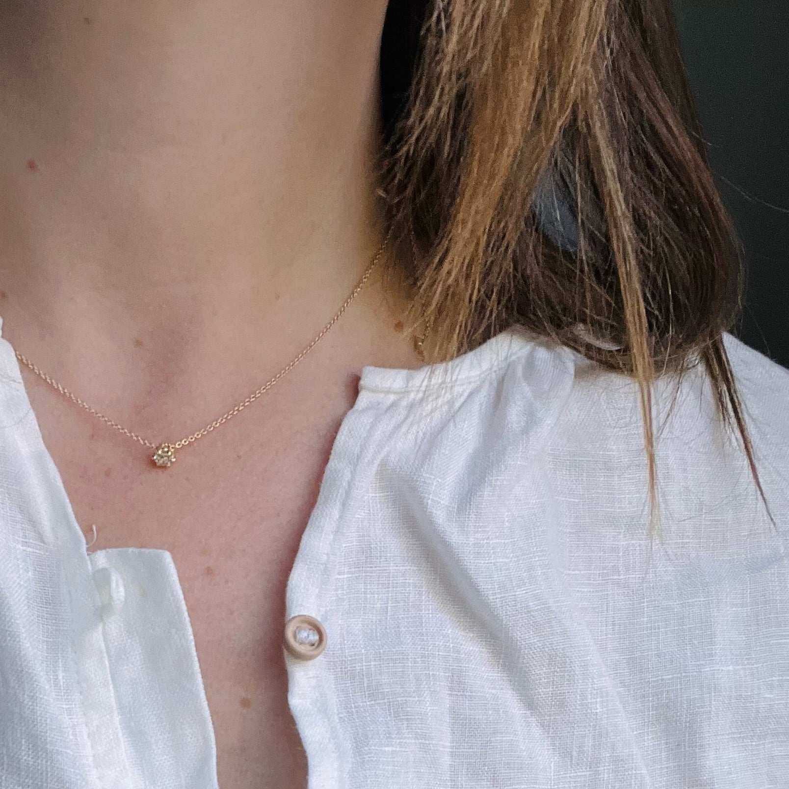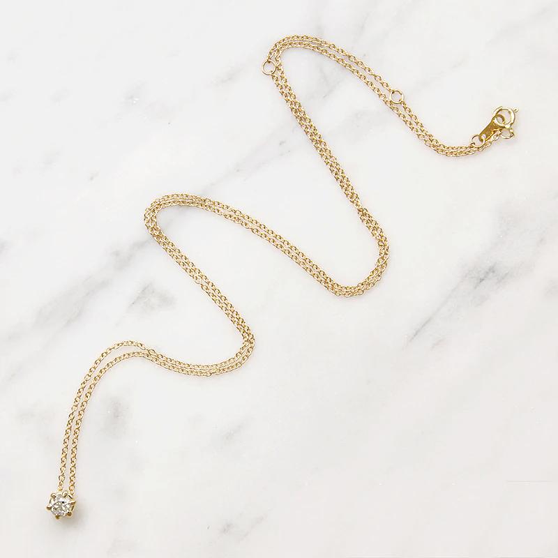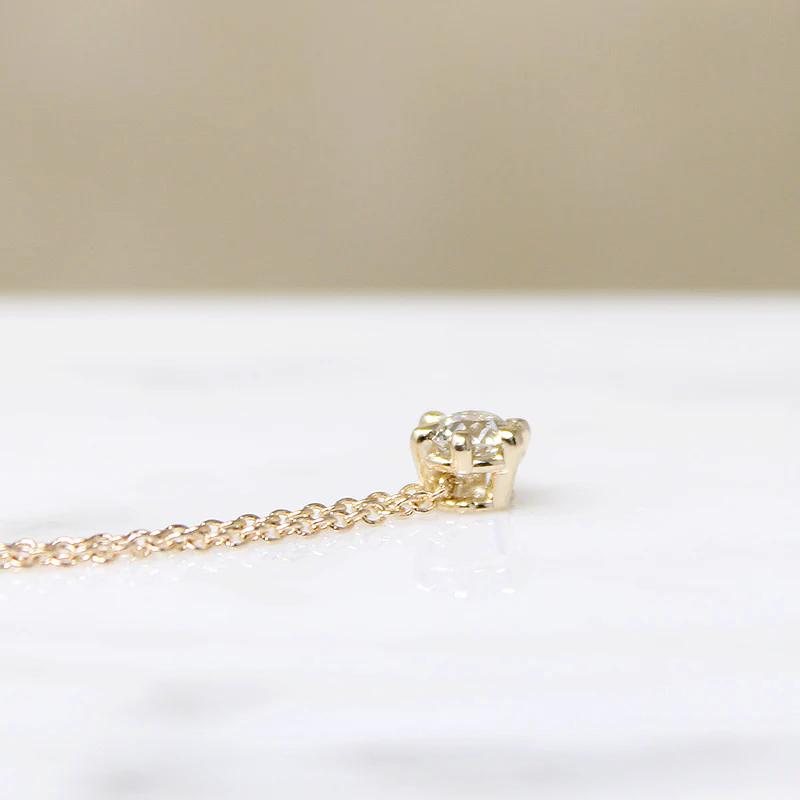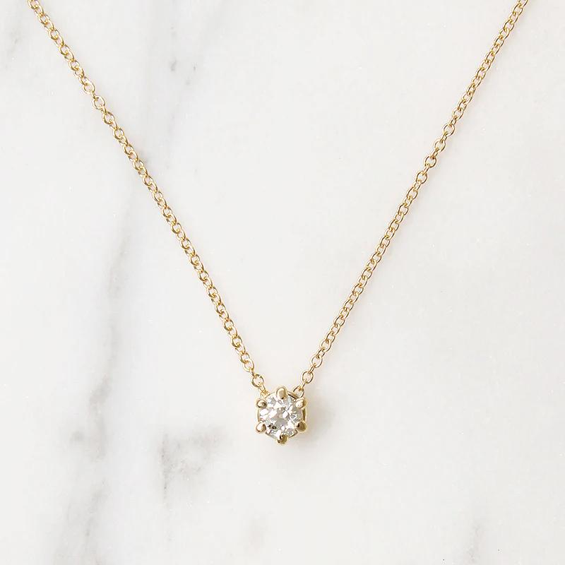 The diamond solitaire pendant is a perennial favorite. A vintage 0.24ct old European cut diamond sparkles in a six-prong basket setting of 14k yellow gold. The basket moves freely on a 14k gold faceted cable chain that fastens with a small, sturdy lobster claw clasp. Simple and sweet, this diamond pendant will certainly become your new favorite go-to necklace.