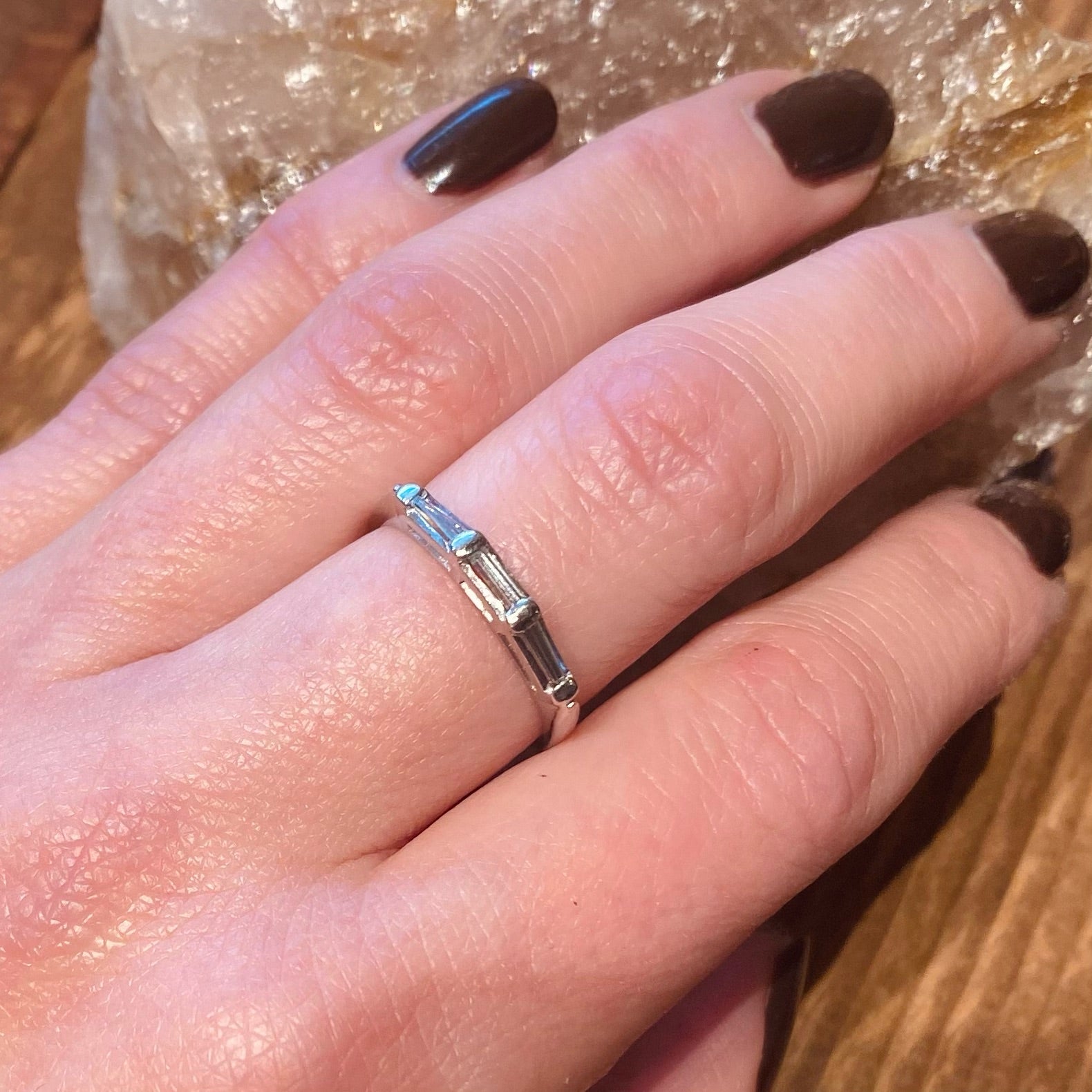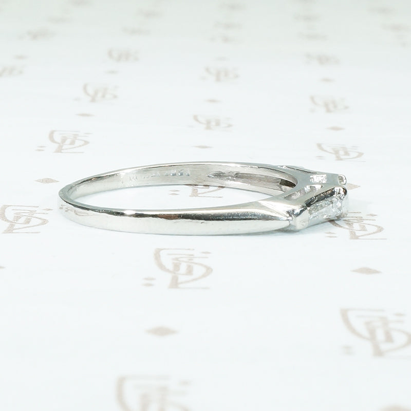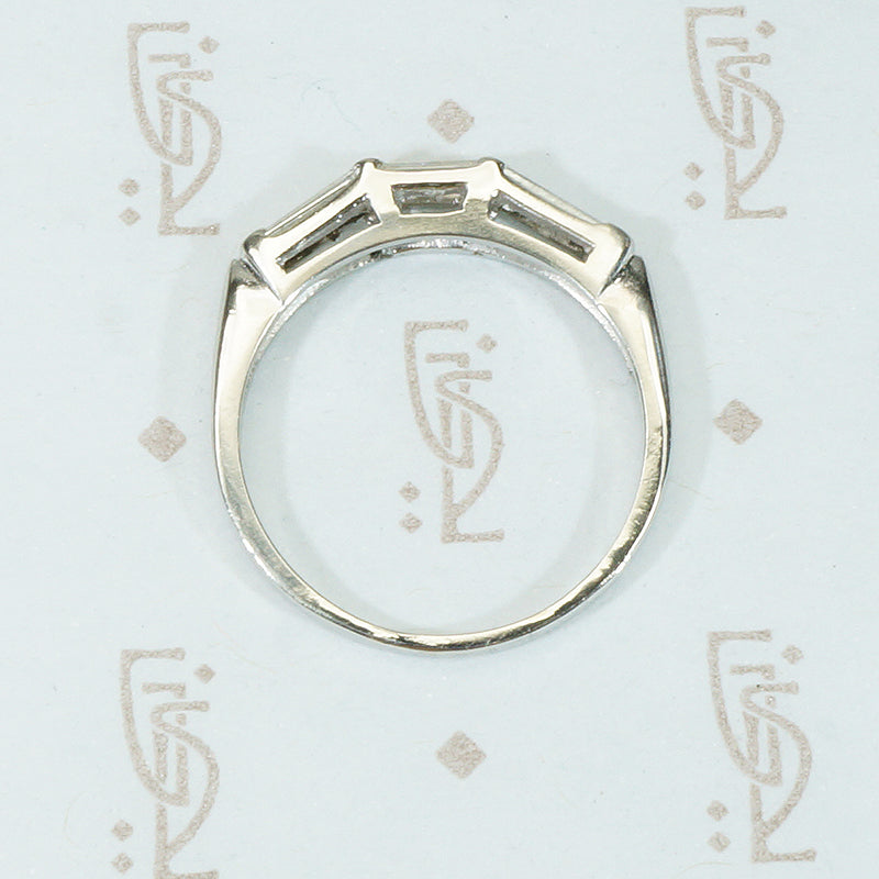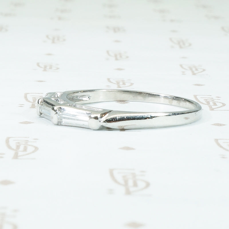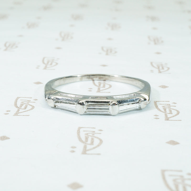 Classic Mid Century elegance. Two tapered diamond baguettes flank a central straight baguette, all bar set in a sleek platinum band. The baguette set top arches slightly to meet the profile of your engagement ring. Clean, modern lines with the craftsmanship only found in vintage. Circa 1940.