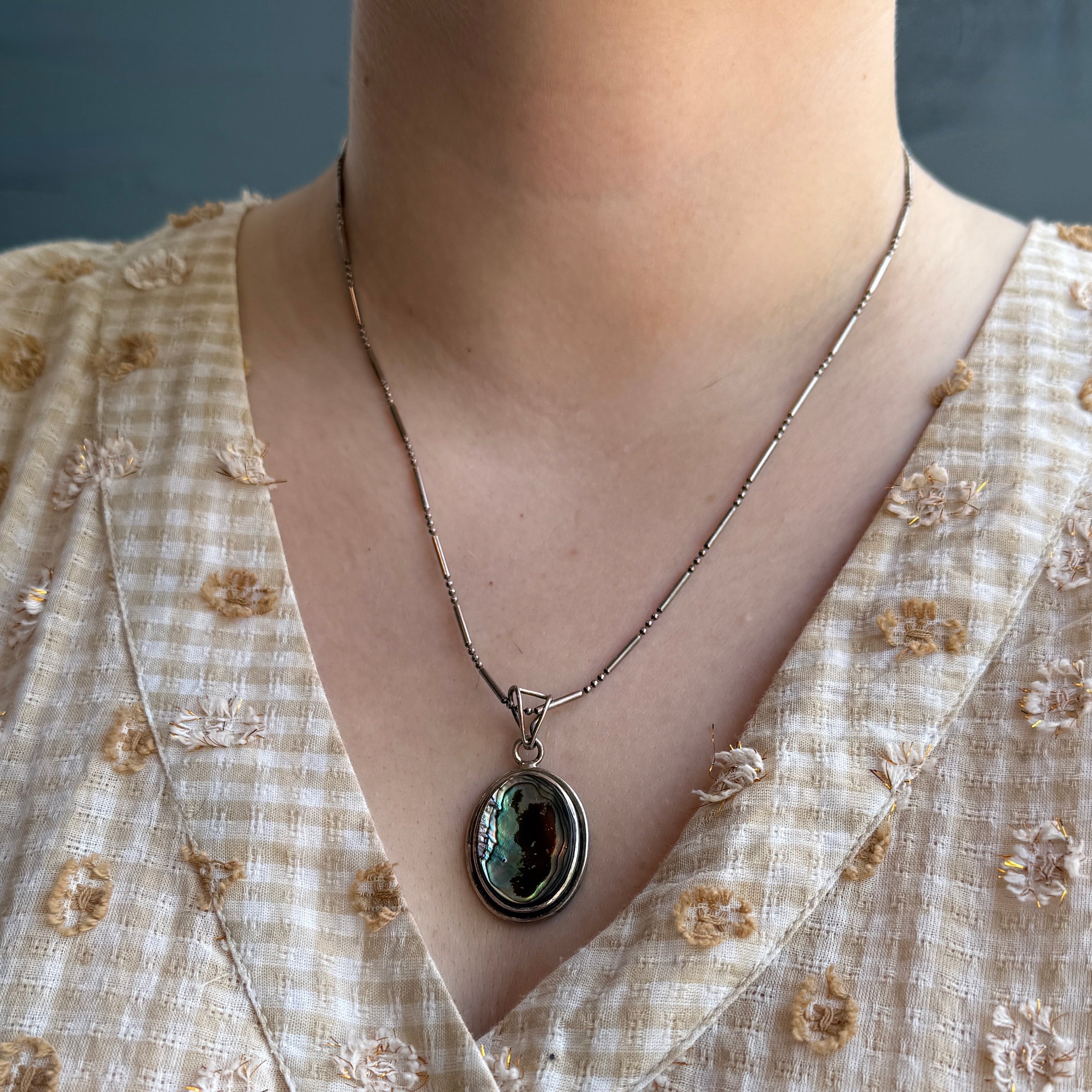 A fun sterling silver pendant set with shining abalone hangs from a sterling silver chain. The 20" long chain is a ball and bar design popular in the 1980s. This 80's necklace will be perfect with a tee and jean jacket.