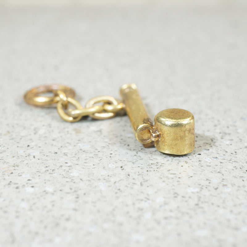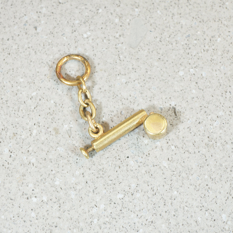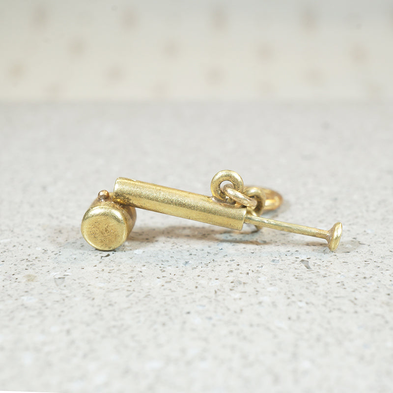 The fanciest way to gently water your plants . . . in miniature! This tiny gold atomizer charm has a fully movable pump. Sadly, no water comes out, but that's really for the best. Tiny and terrific in its detail, this beauty is crafted of 14k gold. Circa 1950.
