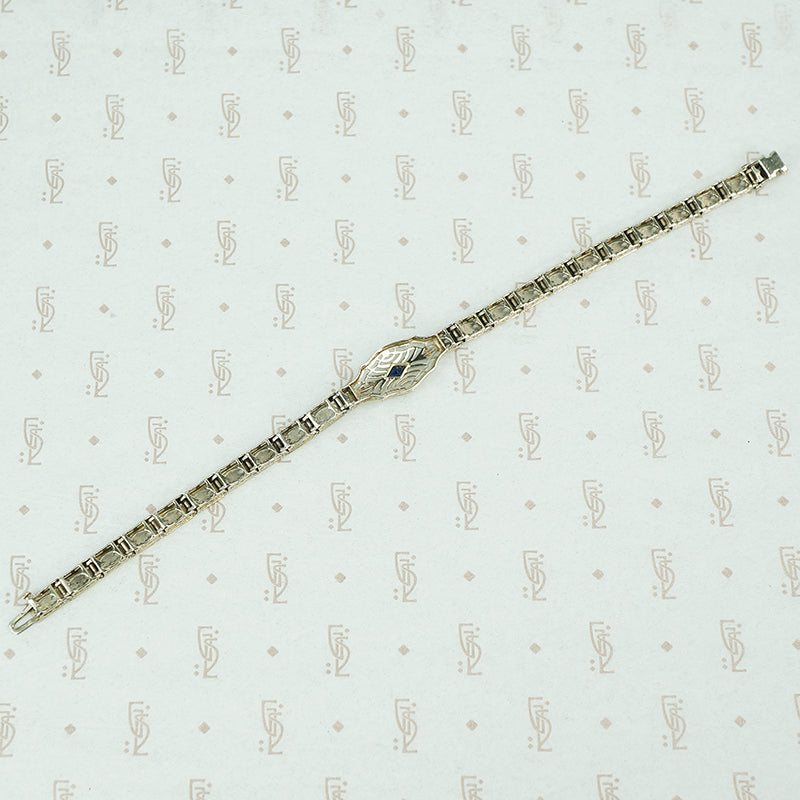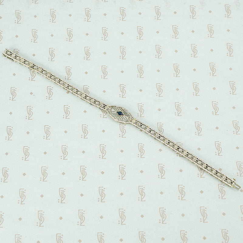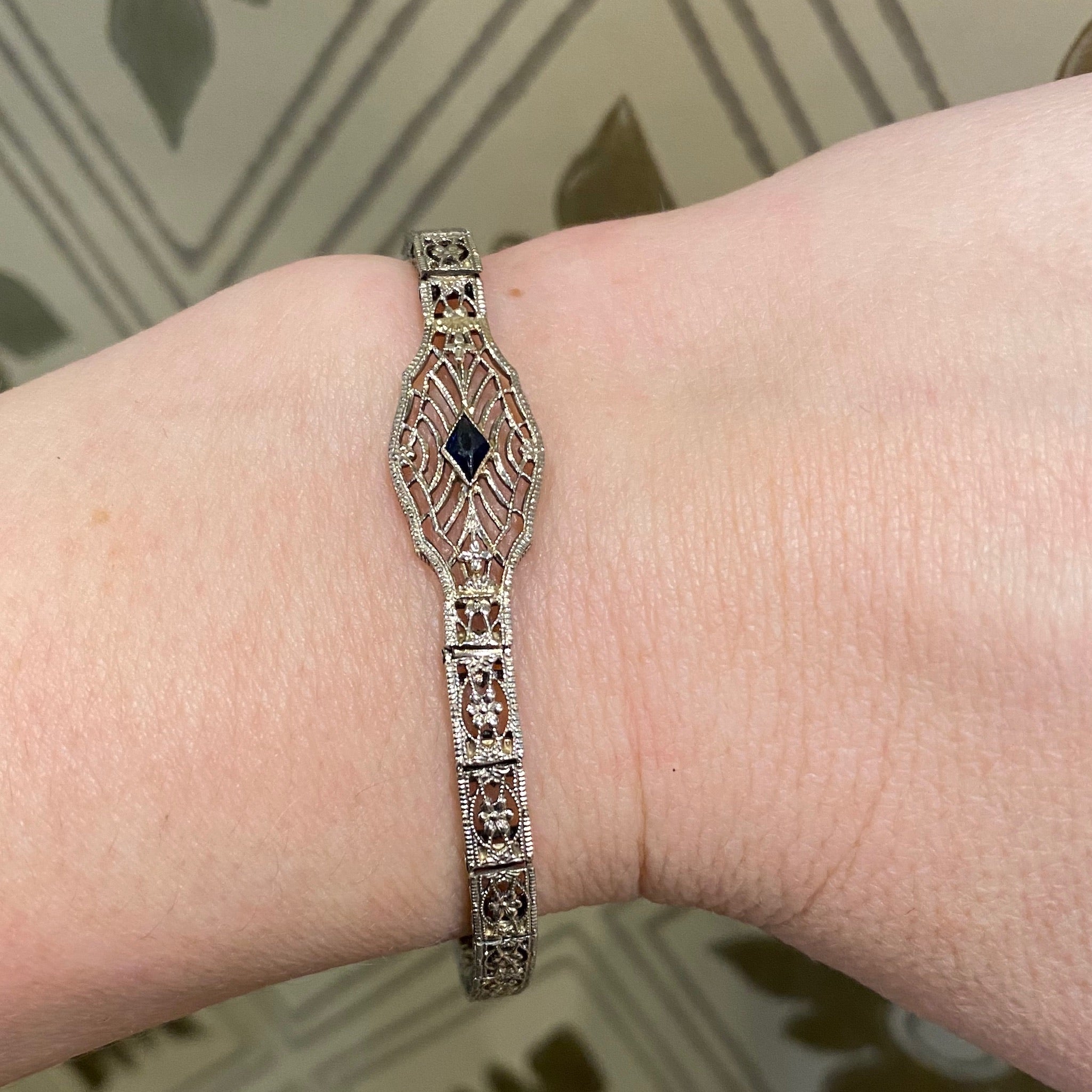 Pretty flowers adorn every link of this Art Deco, 10k white gold filigree bracelet. The decorative central panel holds a lab grown sapphire. The new technology of creating synthetic gemstones was all the rage in the early 20th Century. This bracelet is by Belais, the American jewelry manufacturer that invented and patented white gold in the US in 1918. Always well crafted with attention to detail, Belais is a cut above. Circa 1920.