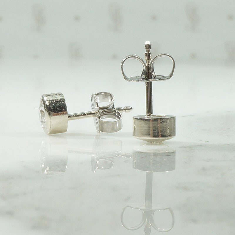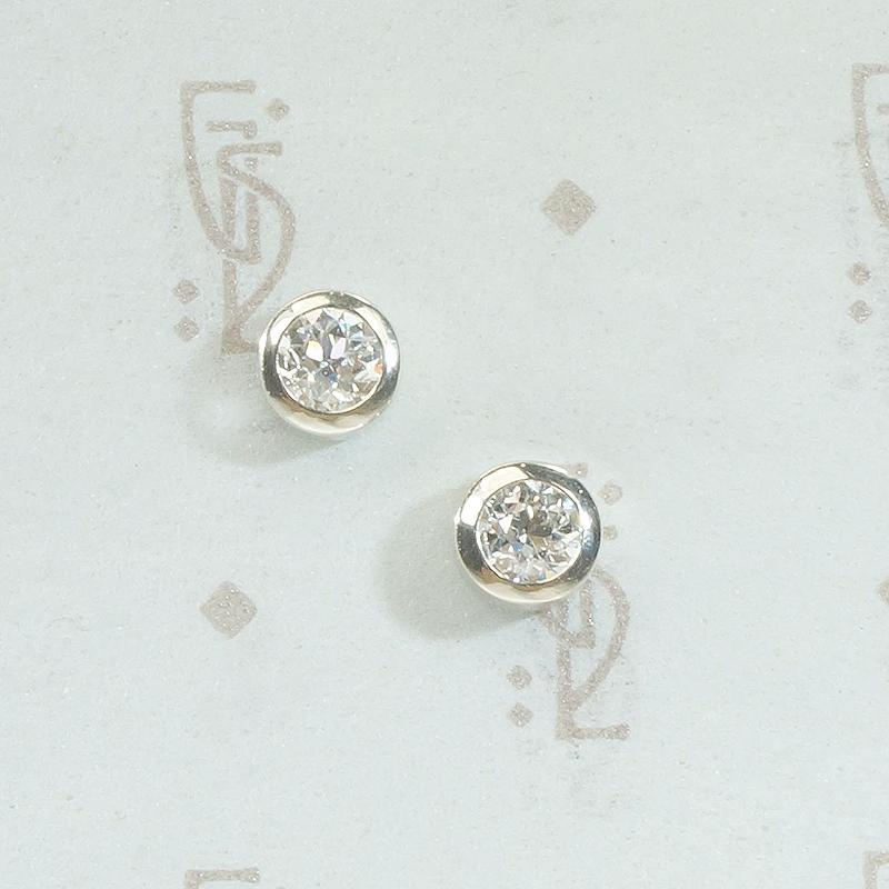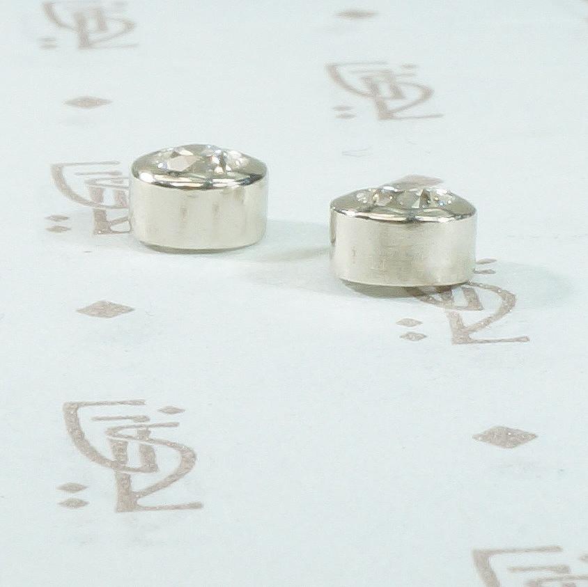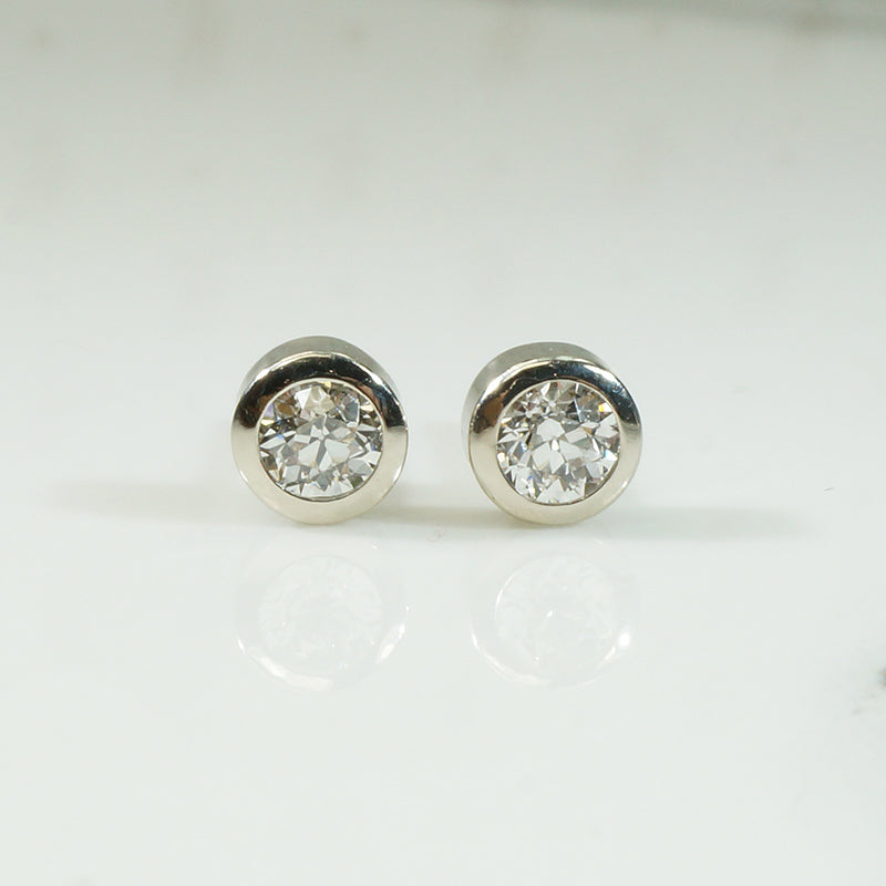 A pair of early brilliant diamonds are timeless, set in 14k white gold bezel studs. Perfect for everyday wear, sturdy and beautiful.