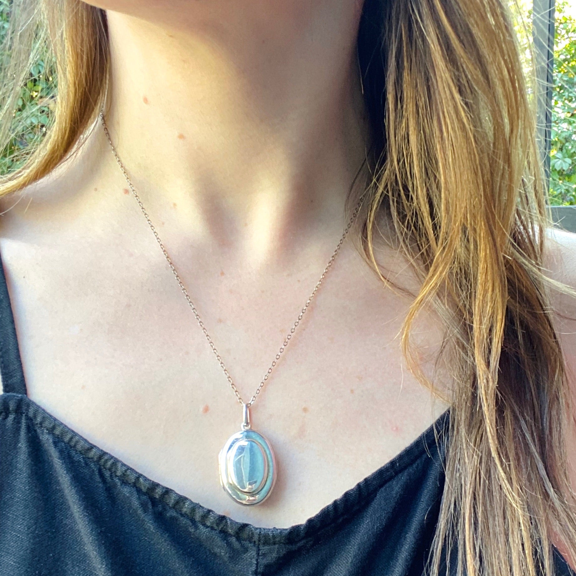 This lovely double-sided oval locket is sleek, shiny sterling silver. One side of the locket opens in the traditional fashion. The other side reveals a smaller locket. The interior of the locket is clean, with no glass or frames. So unusual to find an unengraved vintage silver locket like this one, its simplicity is so attractive. Circa 1980.