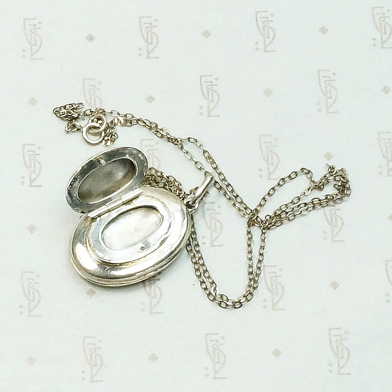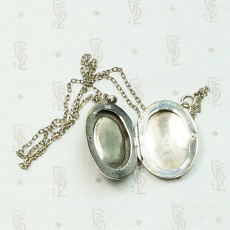 Details.....The locket measures 1.17" by 0.80". The modern sterling silver chain is 18" long. In Very Good Vintage condition. You should always expect some wear on vintage and antique pieces, we consider it part of the charm.