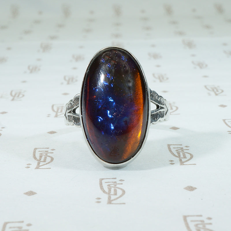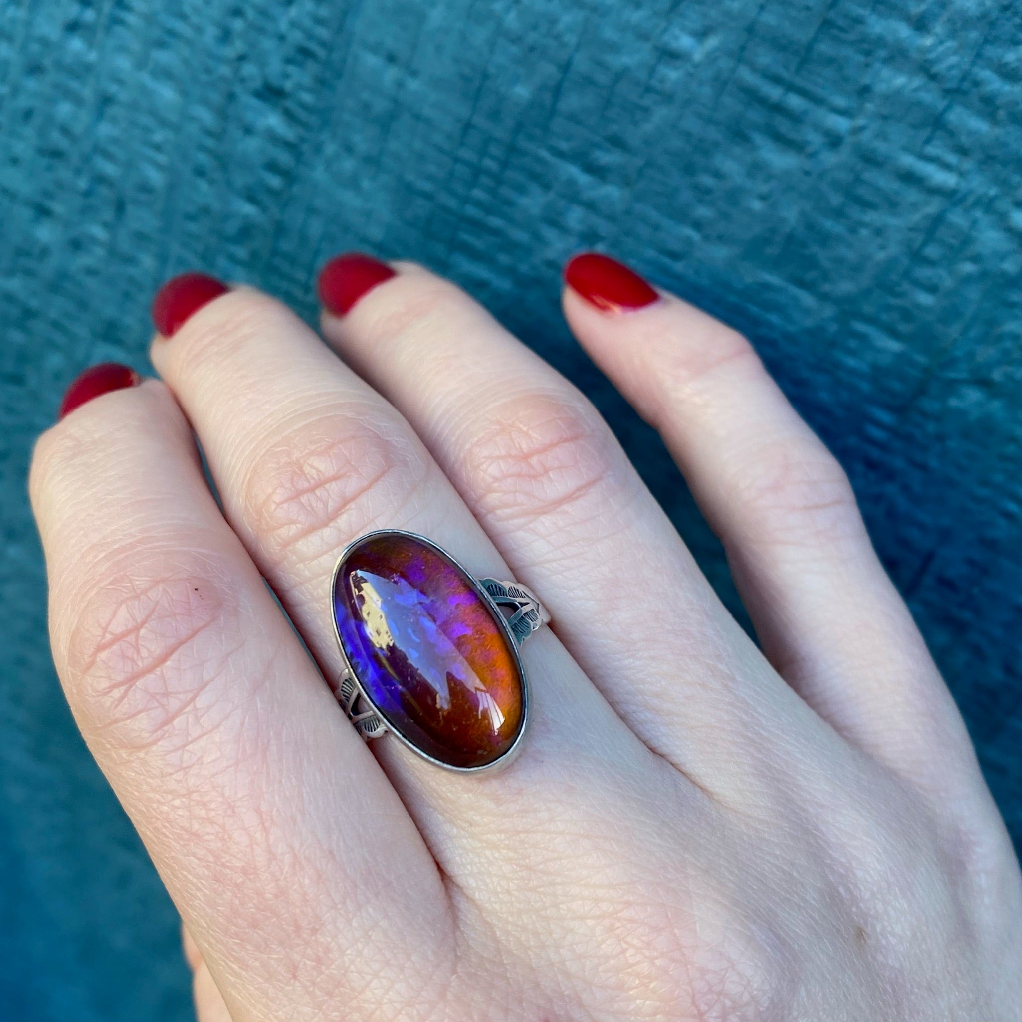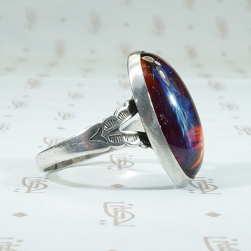 This rather striking blue, pink, and fiery orange glass is often referred to as dragons breath the color changes with the light and the angle but is always dramatic. there are arrow rocker designs in the shapes of arrows on the band. Sterling, circa 1950.