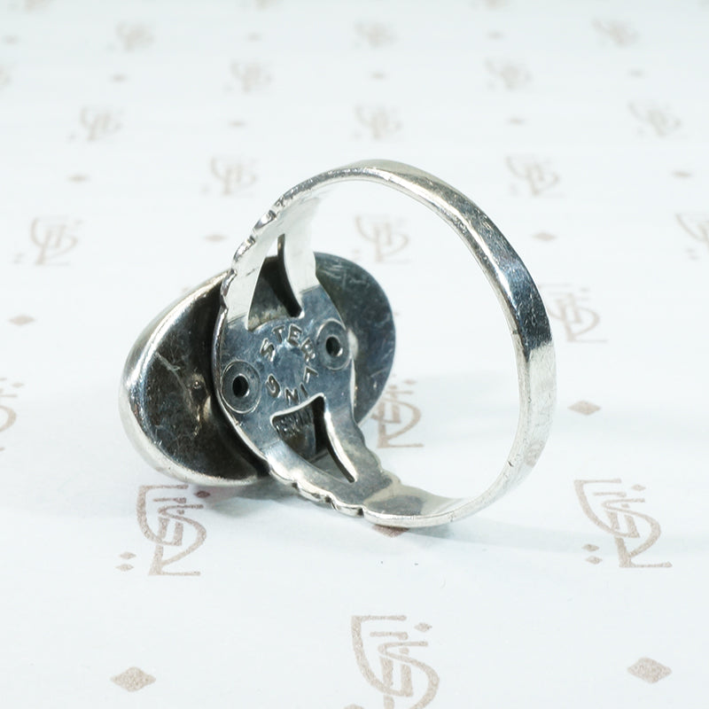 Details.....Currently a size 8.75, this ring can be sized for a fee. The top measures 21.8mm x 12.7mm and the band measures 2.7mm. In Very Good Vintage Condition. You should always expect some wear on vintage and antique jewels, we consider it a part of the charm.