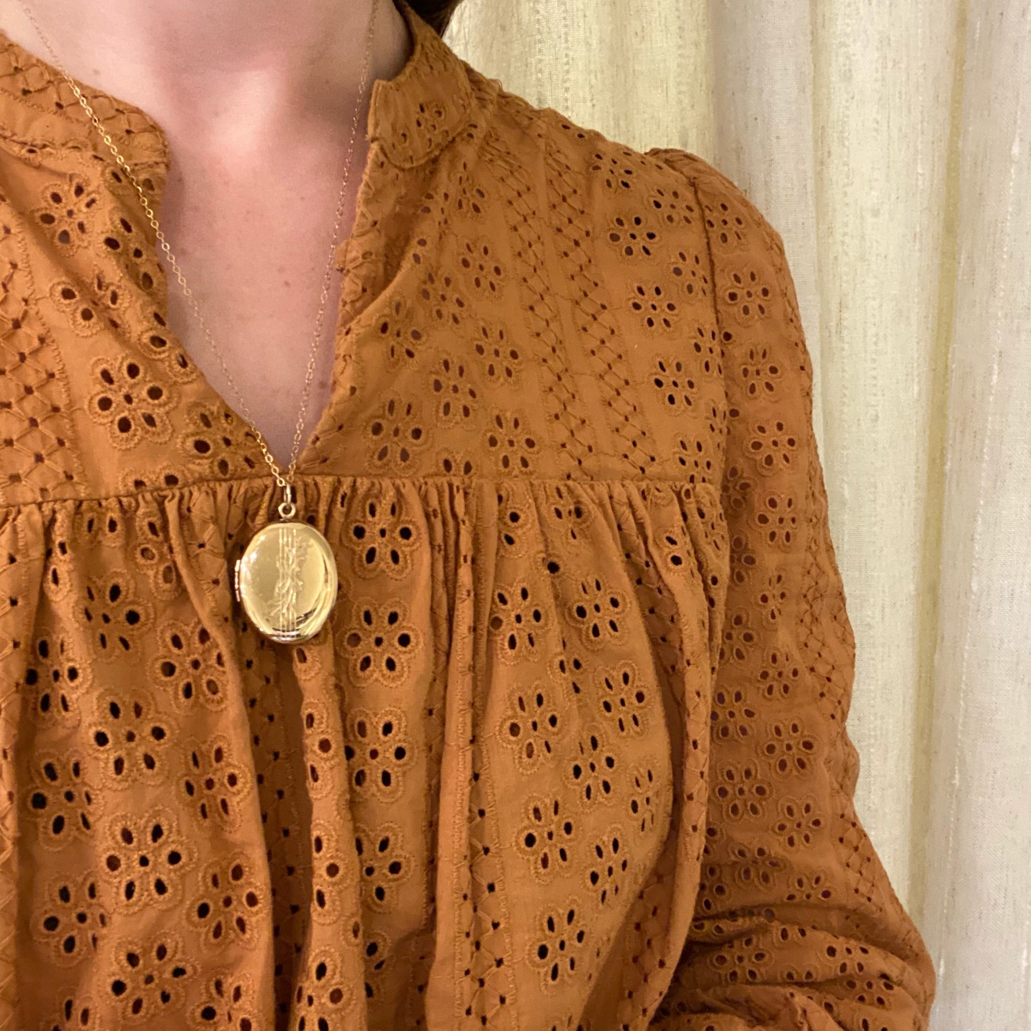 Details.....Locket measures 0.90" by 1.12", 1.27" with bale. The chain is 20" long. In Very Good Vintage Condition, with a minor scuff on the metal. You should always expect some wear on vintage and antique pieces, we consider it part of the charm.