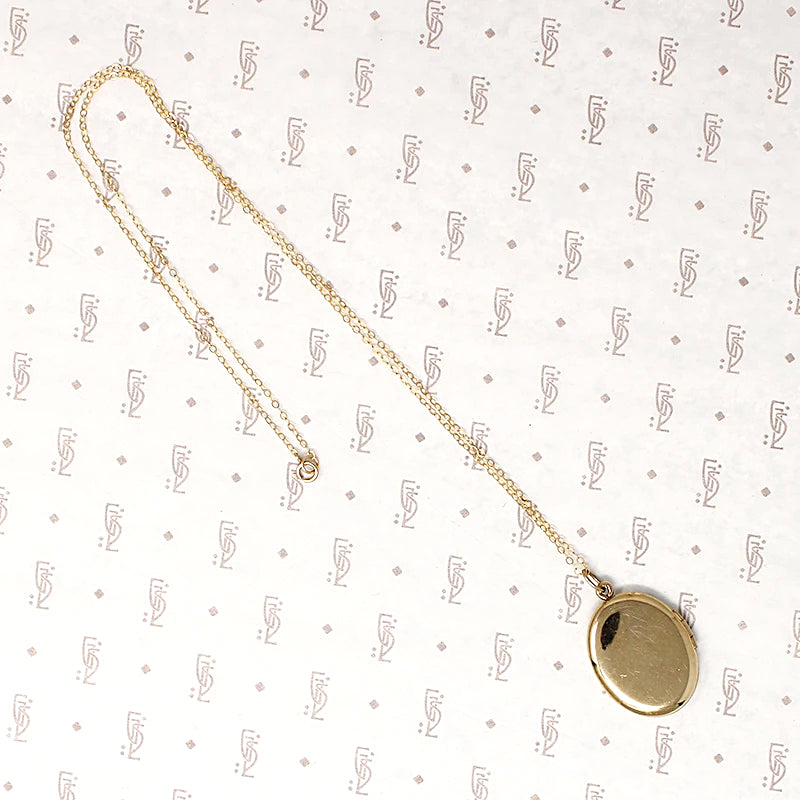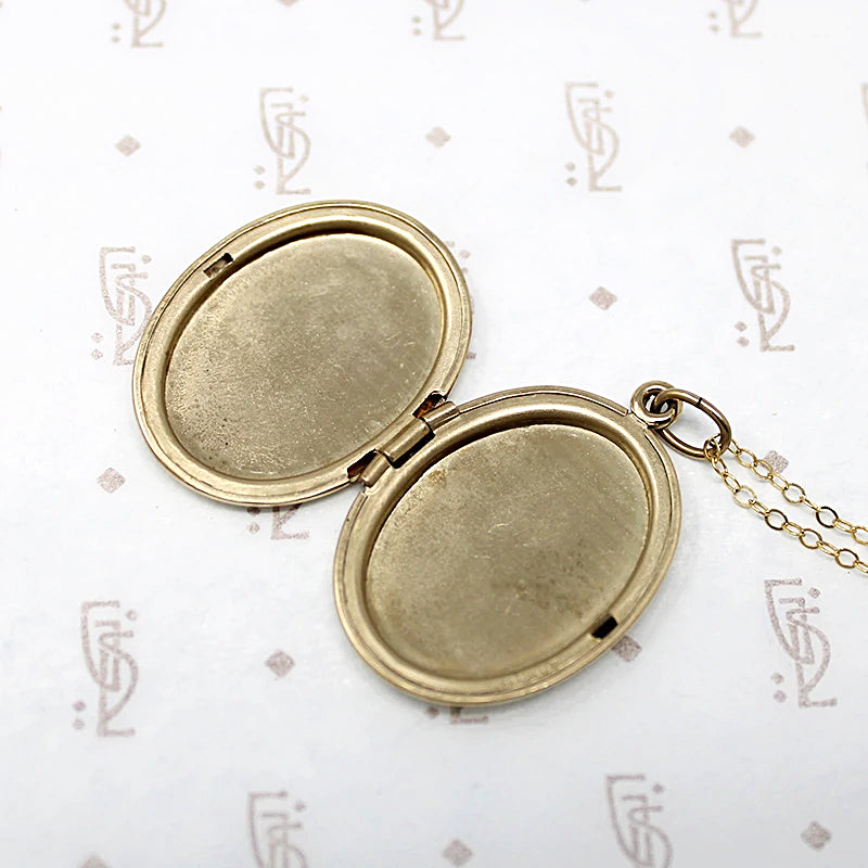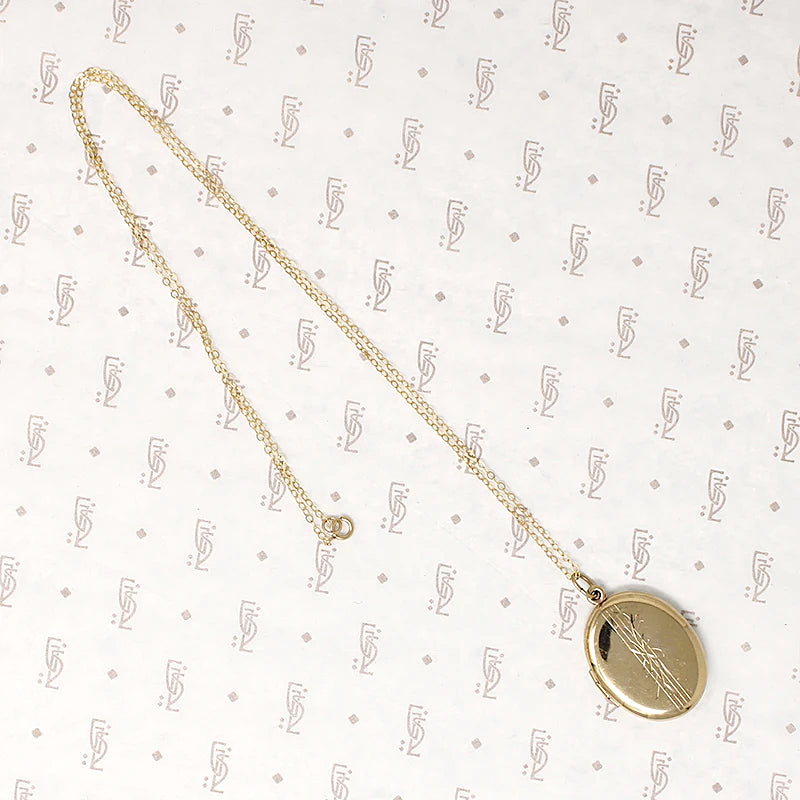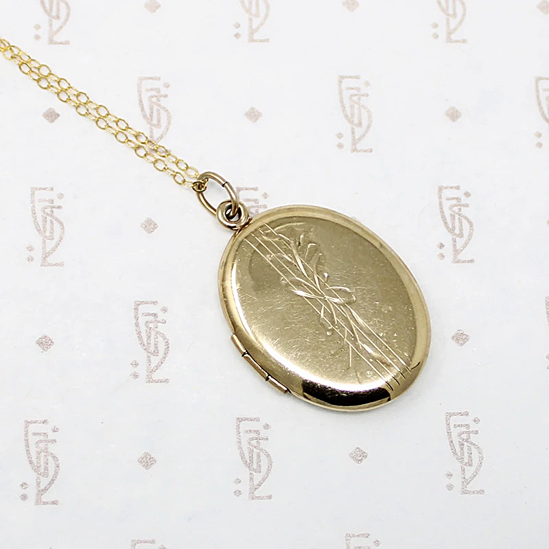 This bright and shiny gold filled oval locket is engraved with stripes down the front, and a sprig and bow design. The back is plain. The interior of the locket is clean with no frames. A gold filled jump ring has been added to the bale, and the gold filled chain is a modern replacement. Circa 1960.