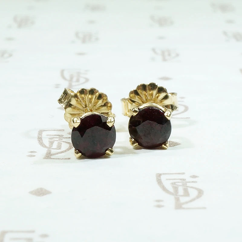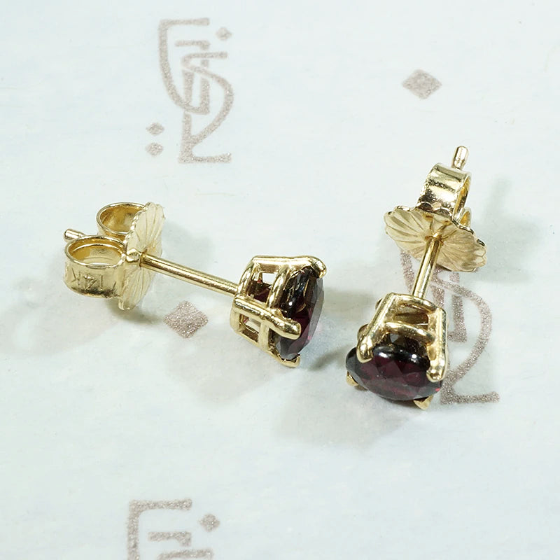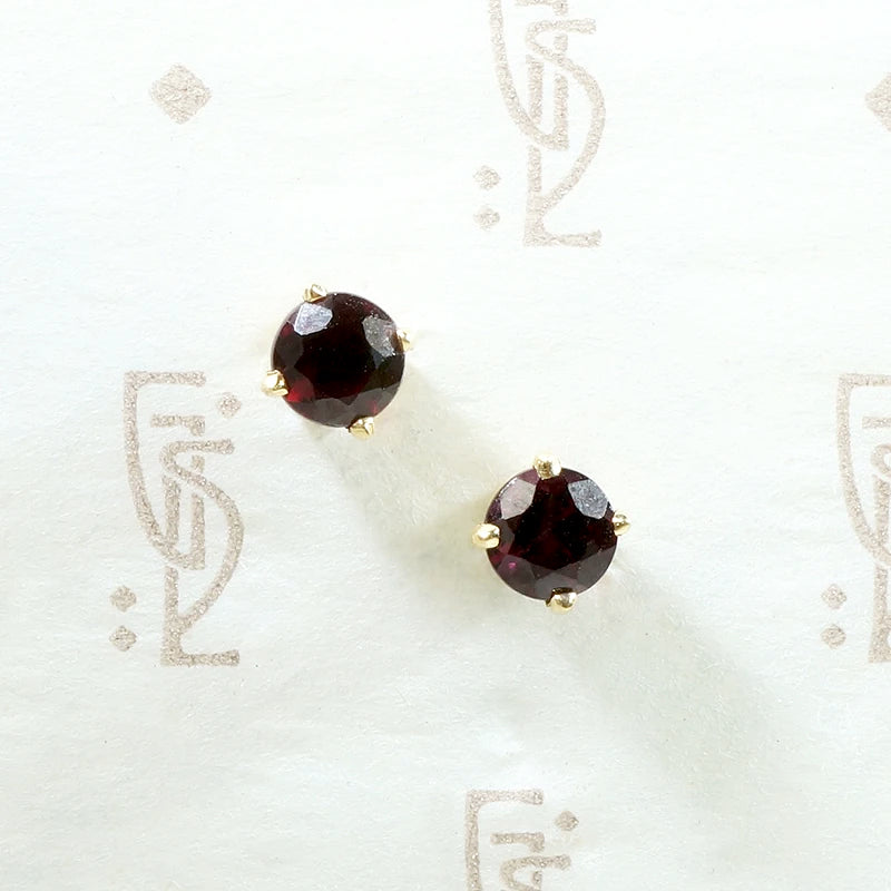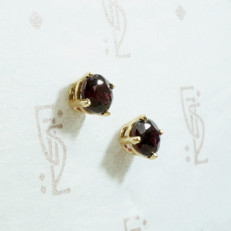 Luscious garnet stud earrings. Round antique garnets with a succulent claret color are set in 14k recycled yellow gold basket settings. Absolutely timeless, always in style and perfect for daily wear.
