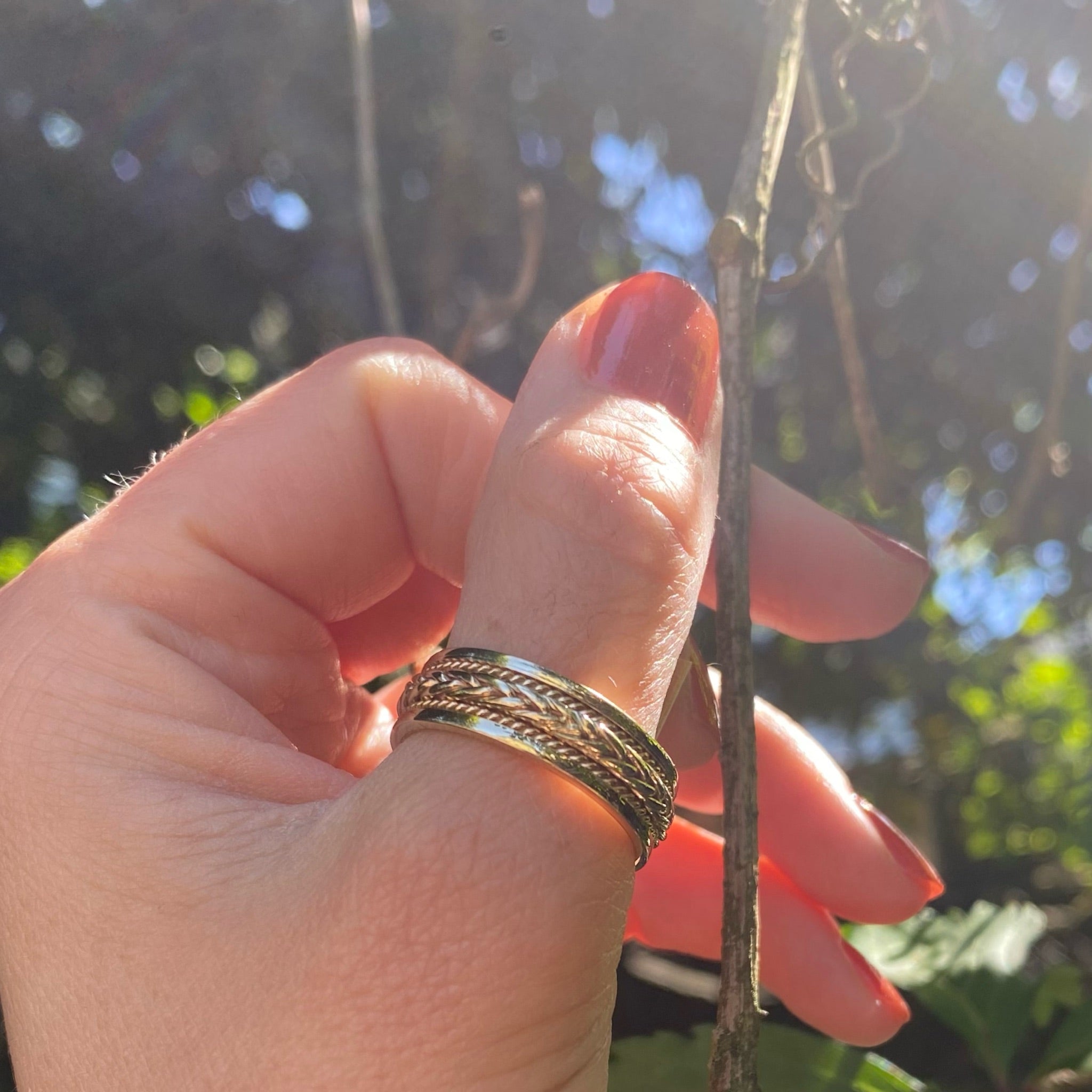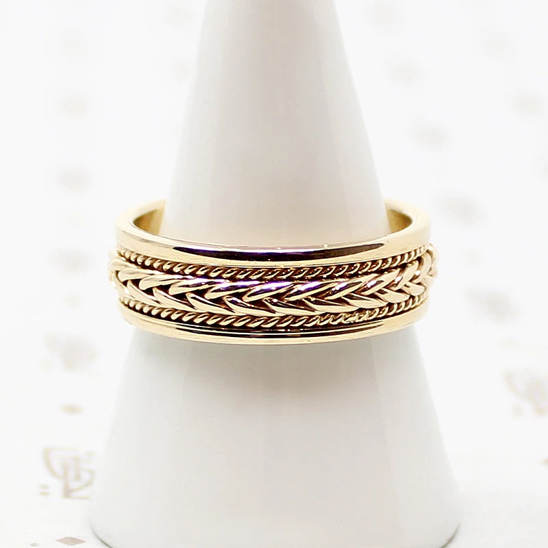 A sophisticated vintage 14k gold wedding band with wonderful details. This heavy band features a woven gold plait edged in a border of twisted gold. So handsome, it is always exciting to find a wedding band with so many wonderful features in a larger size like this.