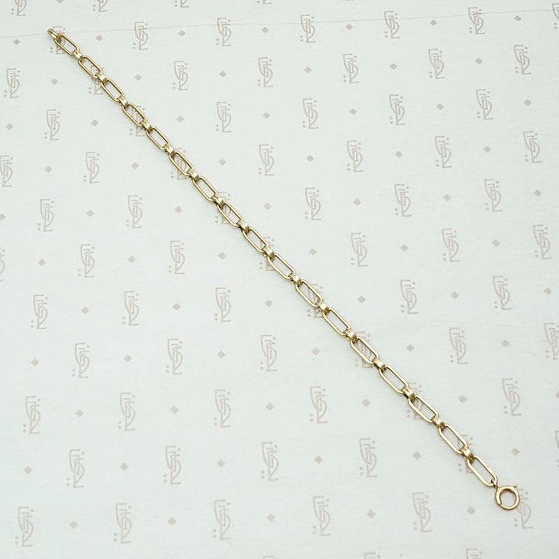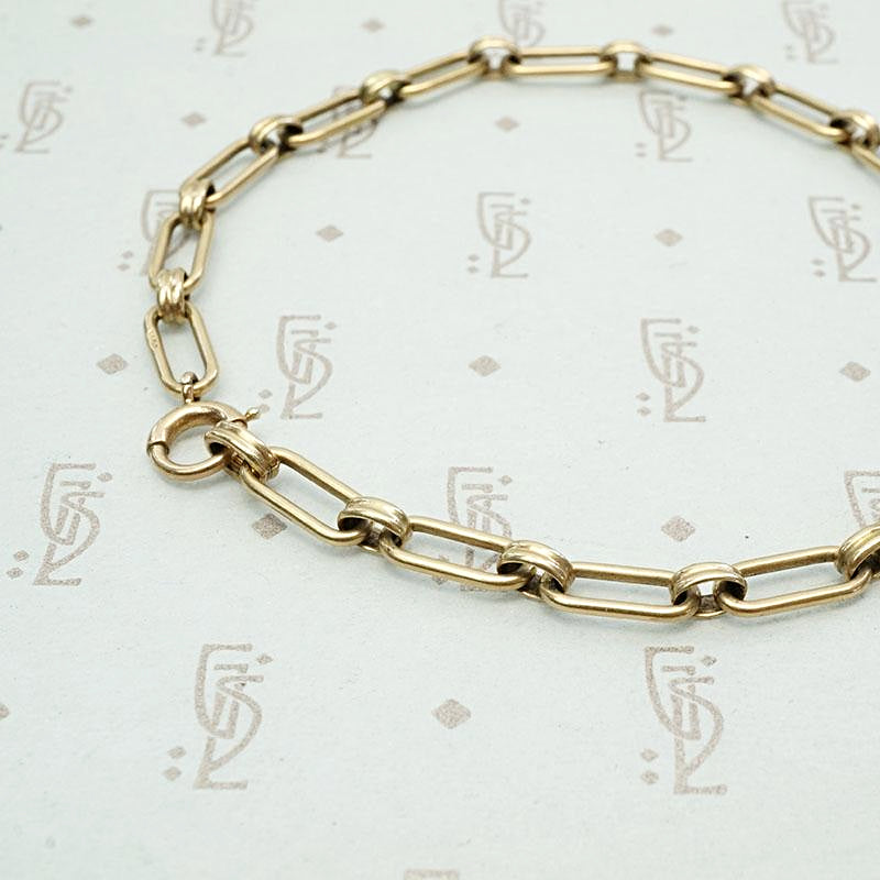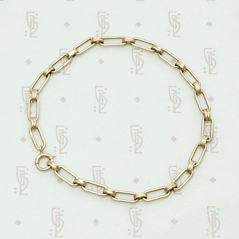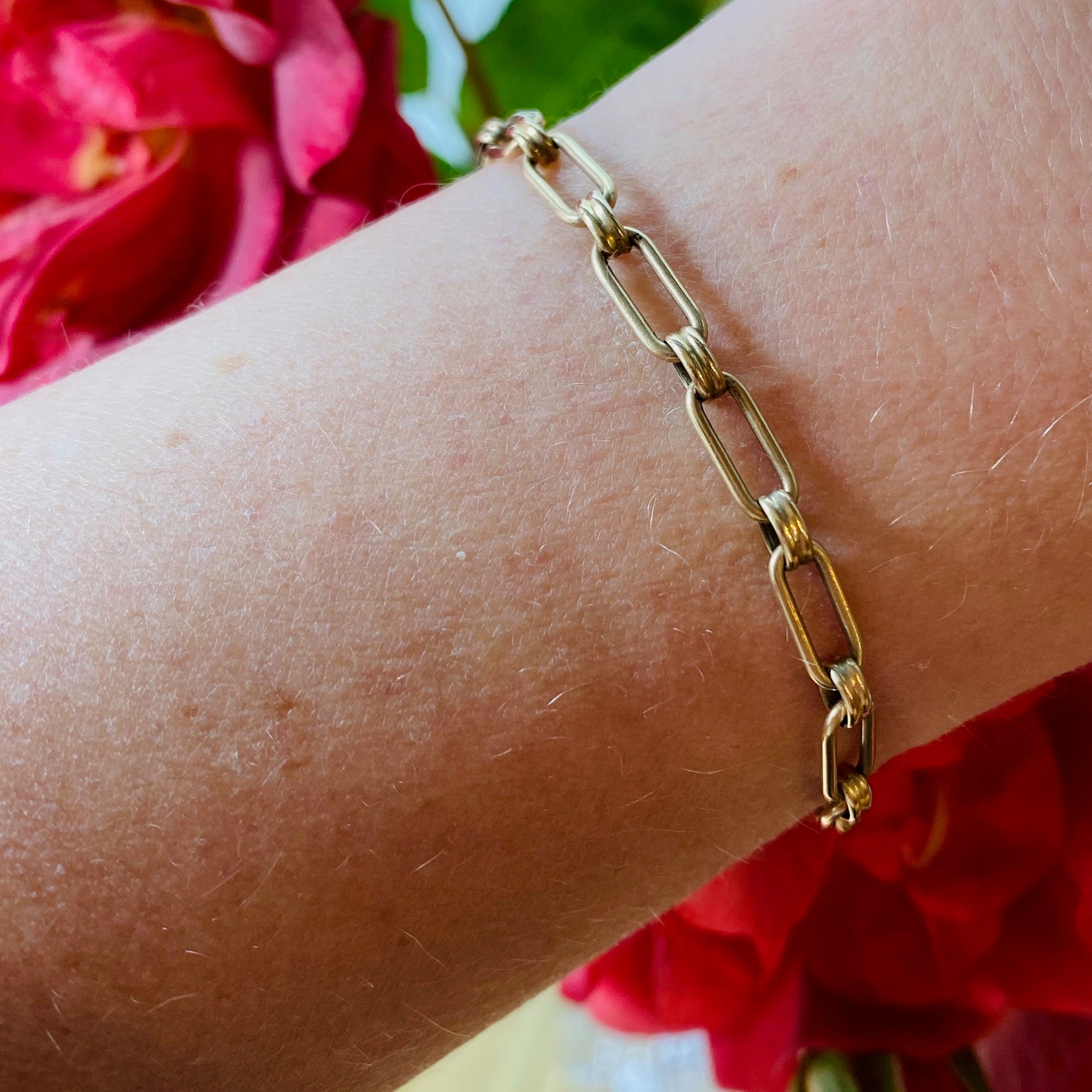 This vintage 14k gold paperclip link bracelet is so stylish and wearable. The C-clasp is sturdy and secure. Handsome, with attractively grooved alternate links, it is perfect to wear on its own or added to your wrist stack. This would make a great charm bracelet, too. Circa 1940.