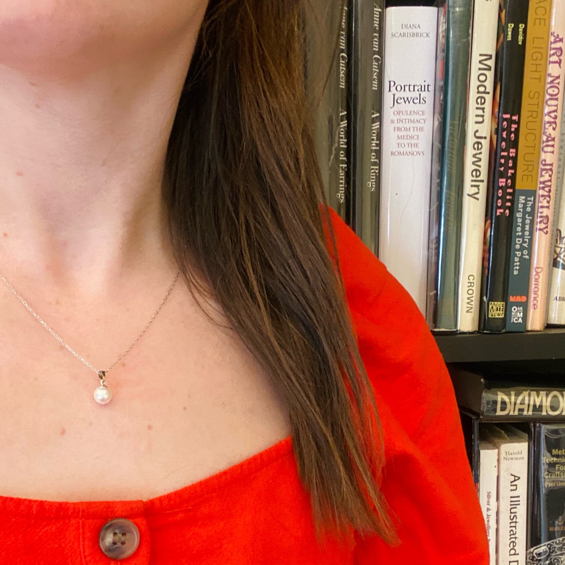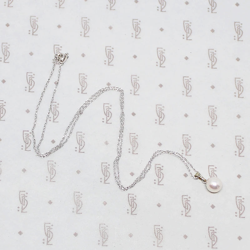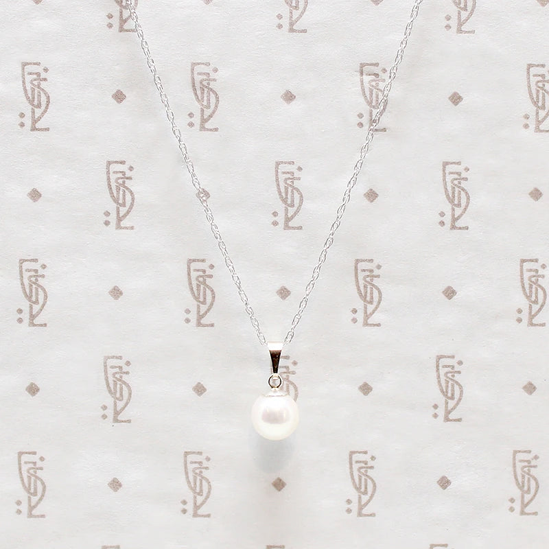 A classic solitaire pearl necklace. The silvery-white cultured pearl is so simple and elegant. The pearl is suspended from a simple white gold bale. The chain is modern recycled 14k white gold and the pearl pendant dates from circa 1950.