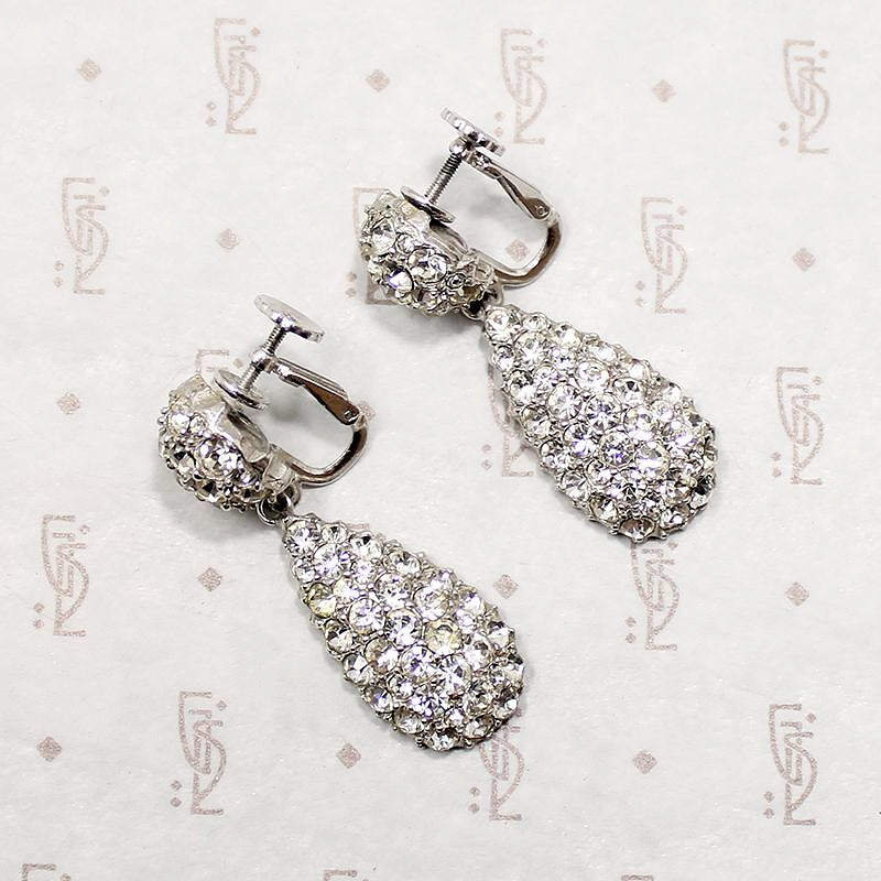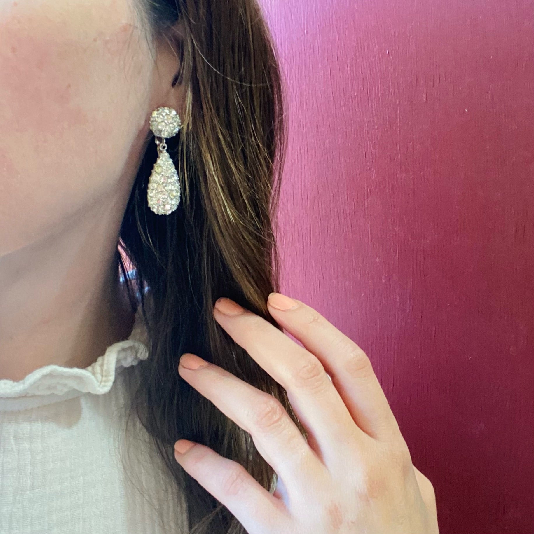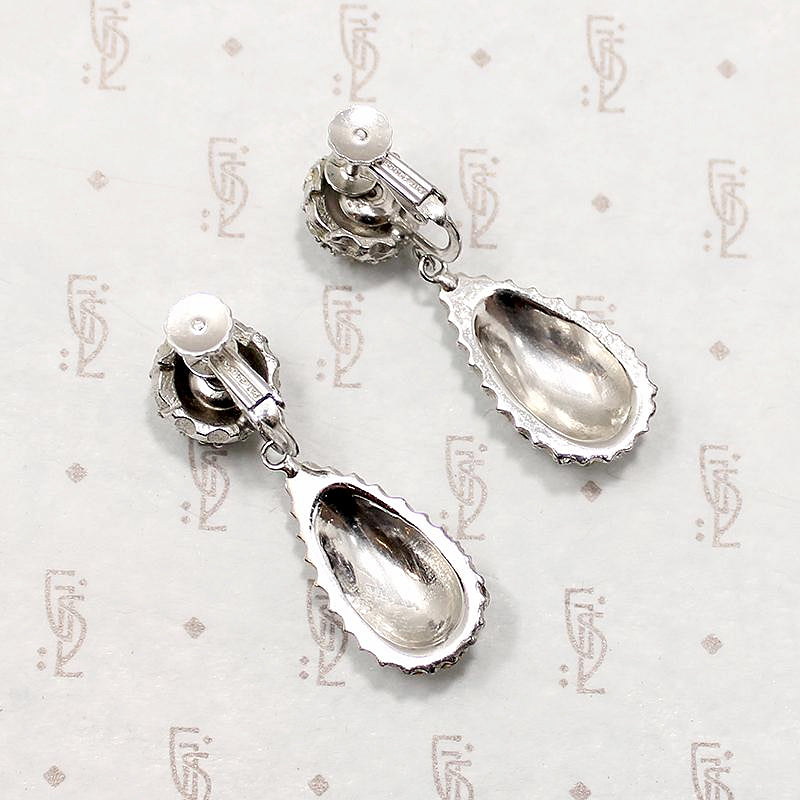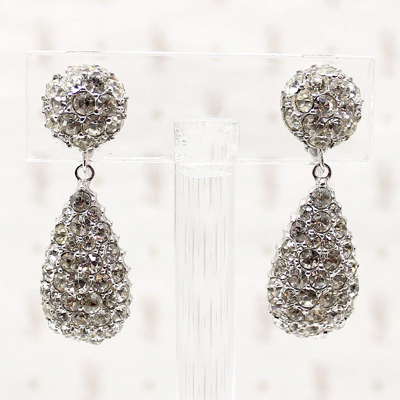 These fabulous vintage pendulum earrings sparkle and swing. Teardrop-shaped pendulums hang from button-shaped tops with a point of articulation that allows for easy movement. The silver tone costume metal is pave-set with round white rhinestones, a luxe look that reflects the glamour and fun of the 1960s. These beauties remind us of the early days of Warhol's Factory.