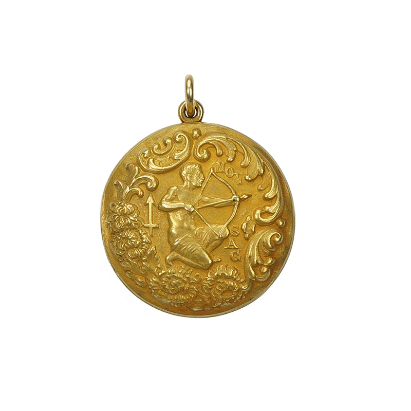 This Sagittarius locket is spectacular. The incredible repoussé details are enhanced by the original matte finish it was given in 1920. Like new condition. We have 3 of these, Libra, Scorpio, and Sagittarius. All in 14k gold.