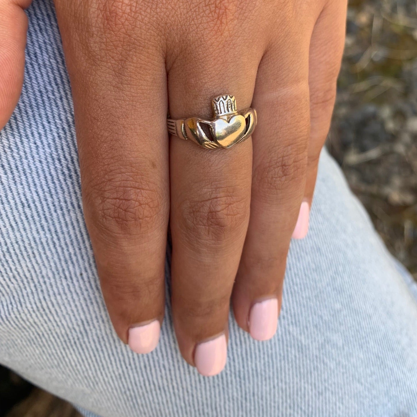 A classic crowned Claddagh ring in sterling silver. Circa 1980.