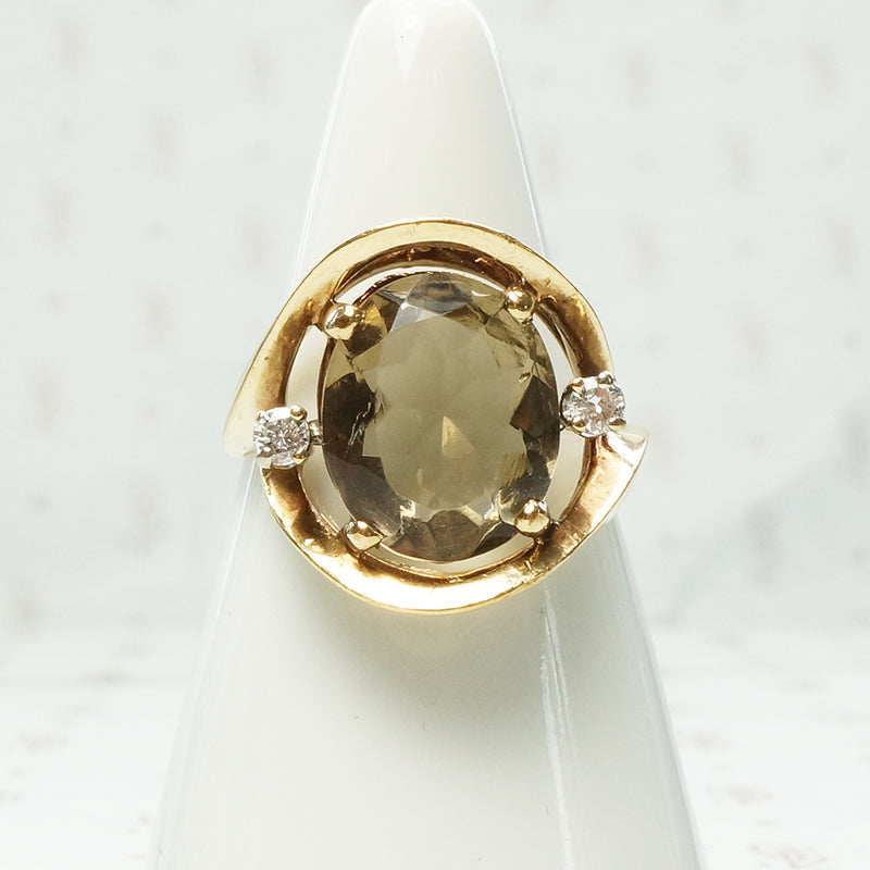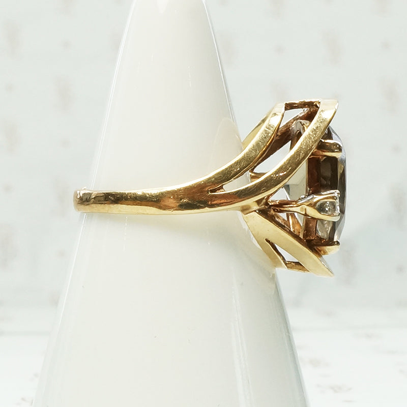 The smoky quartz in this 1960's statement ring is a wonderful hue which is enlivened by the diamonds to either side. The oval gold halo that surrounds the gem just adds to its presence. 10k yellow gold, perfect for every day wear, and totally unique like you.