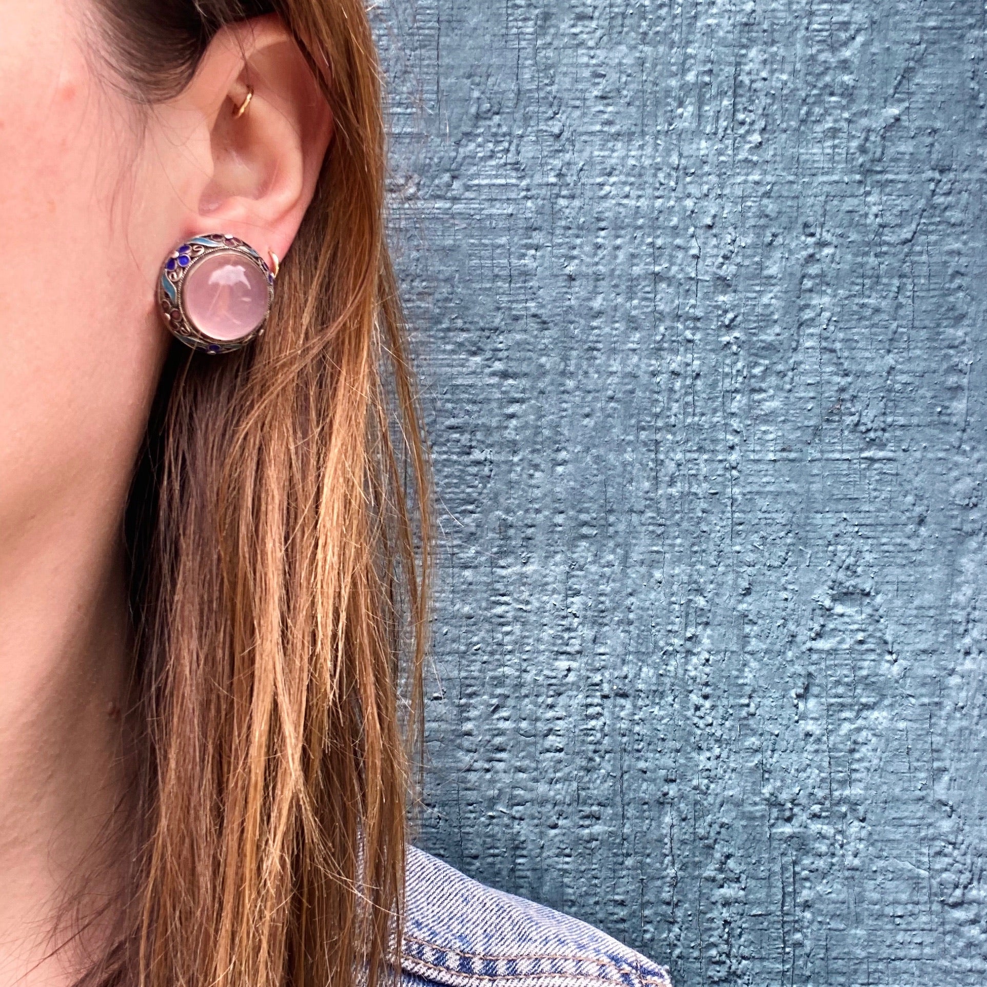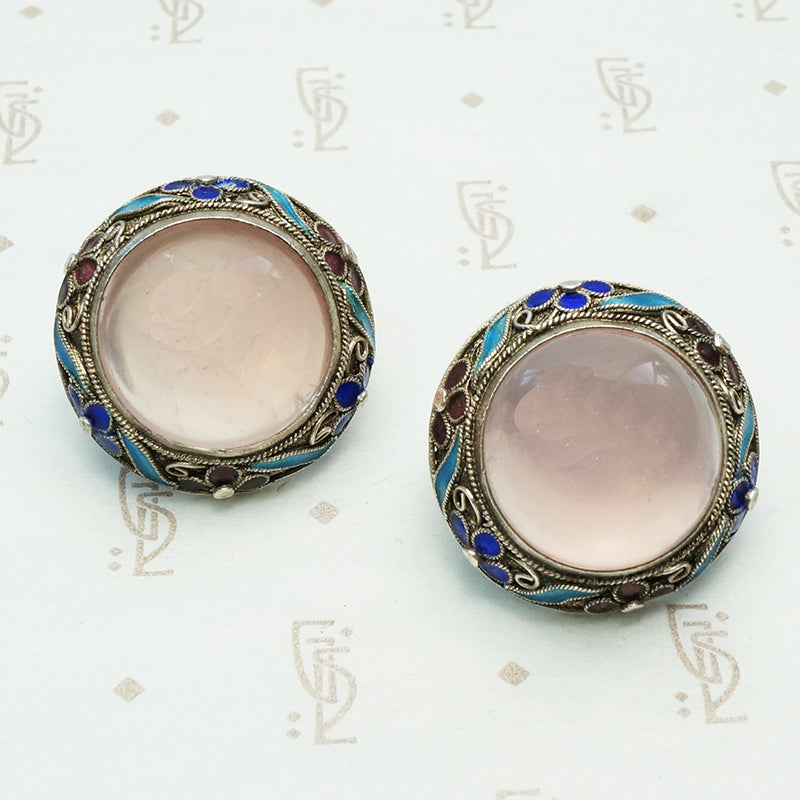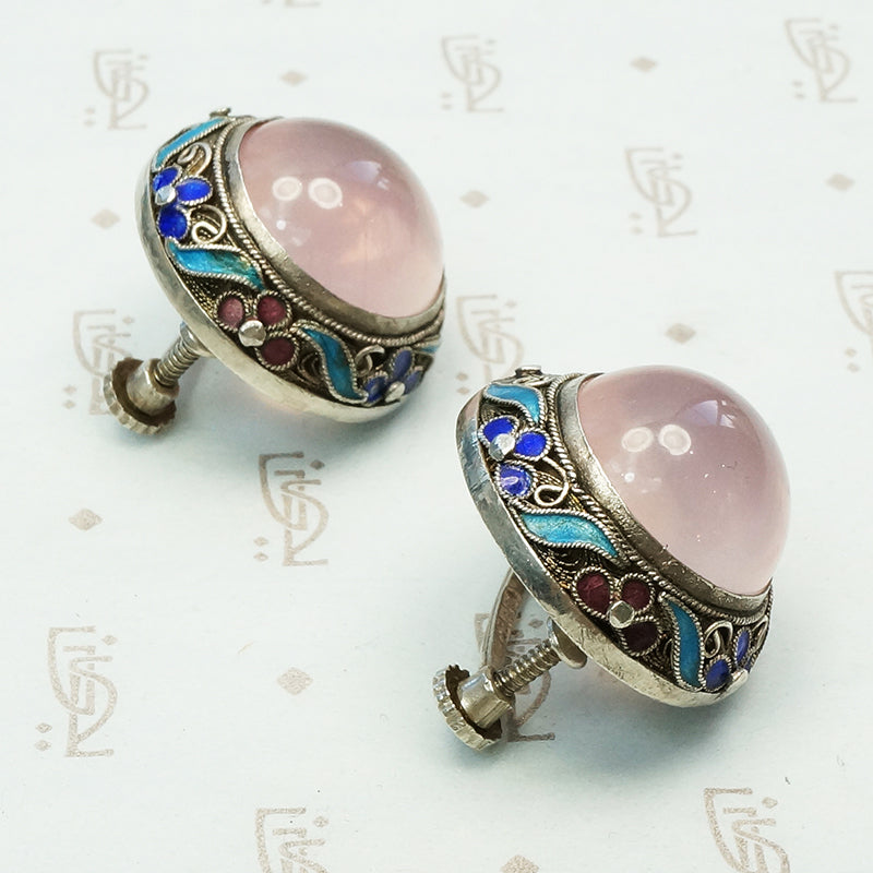 Pretty pink quartz cabochons are set in sterling silver filigree frames decorated with blue enameled flowers. The vintage 1920's earrings are Chinese and screw back.