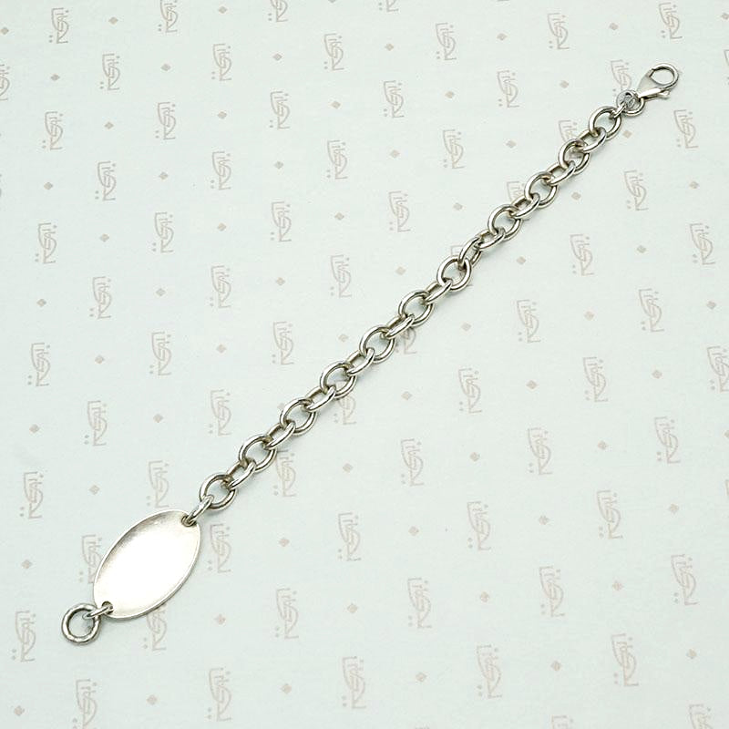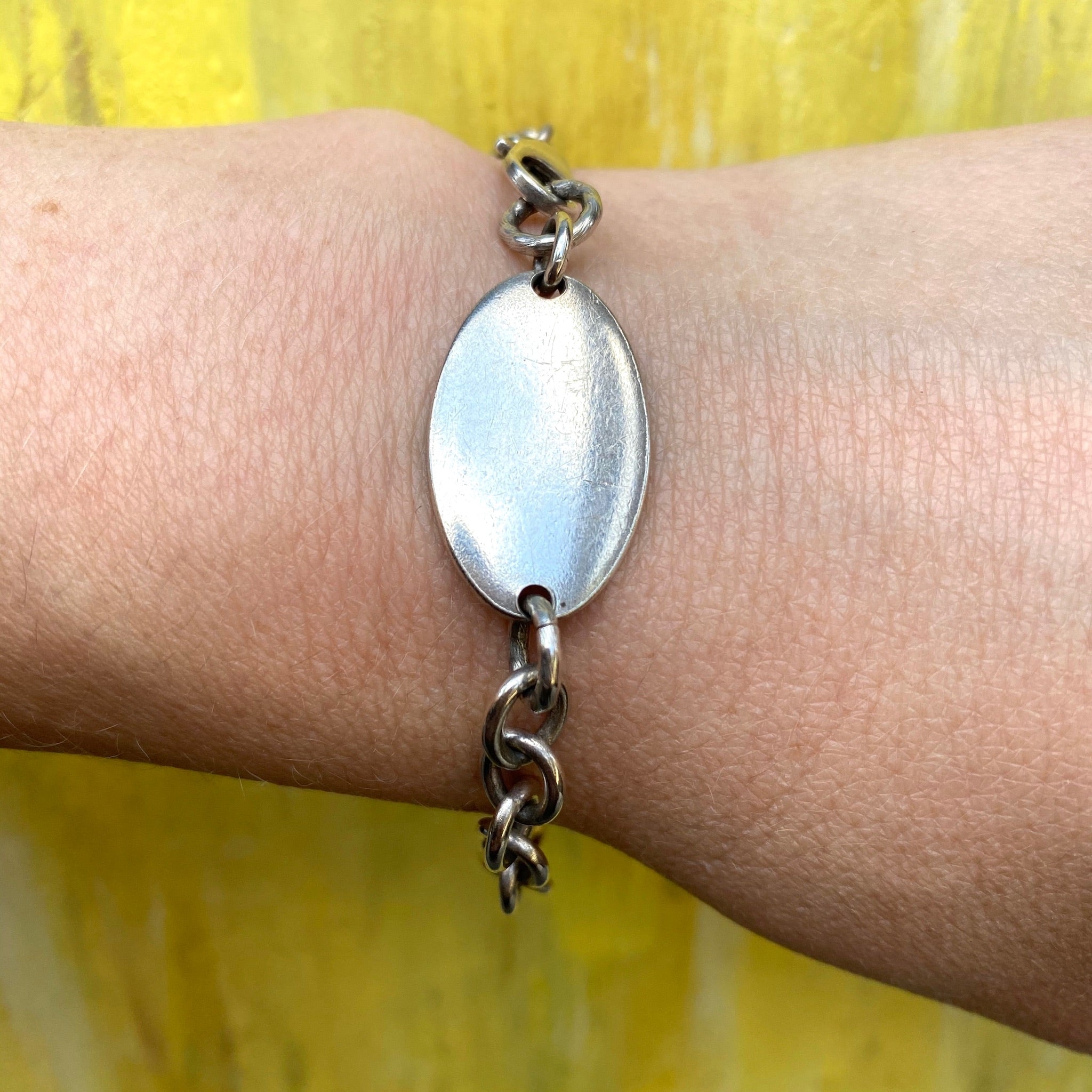 A vintage sterling silver engravable nameplate bracelet. The bracelet is composed of an oval plaque on a chunky cable link chain. It is secured by a heavy lobster claw clasp. This is a great piece as is, or have the plaque engraved with the sentiment of your choice. Circa 1980.