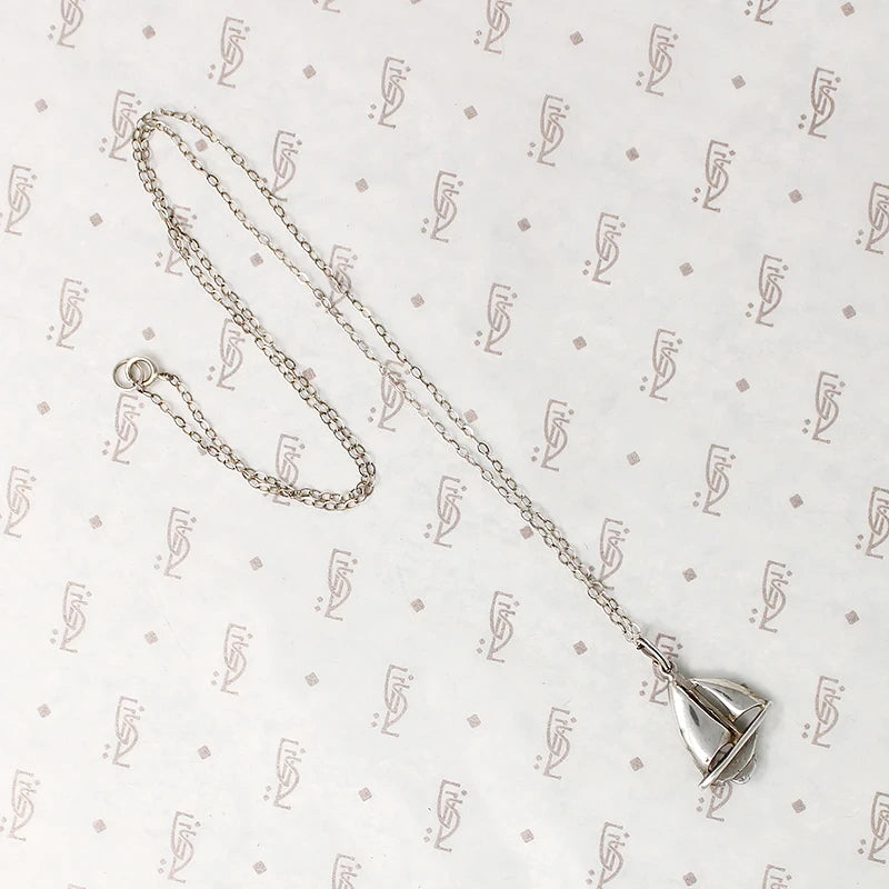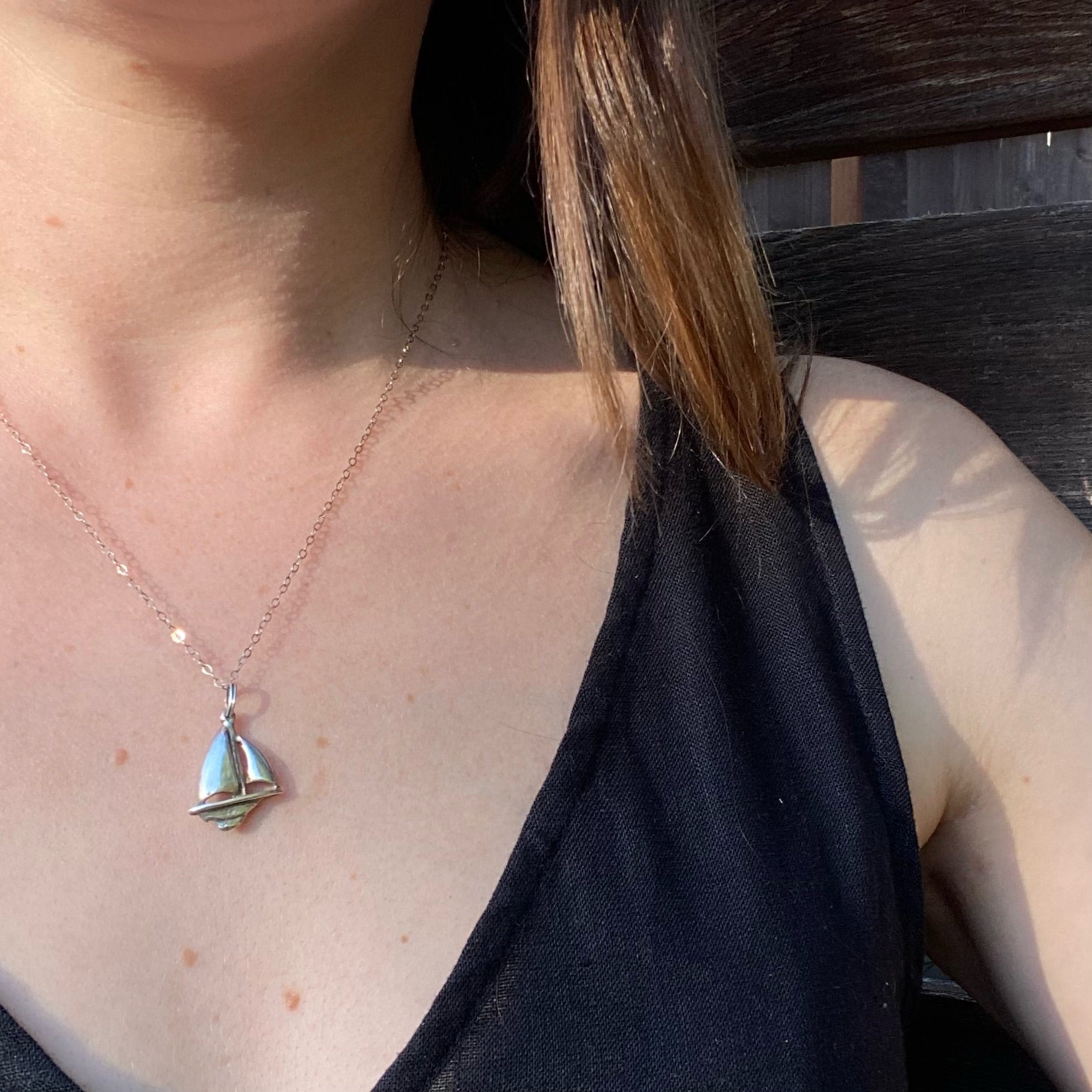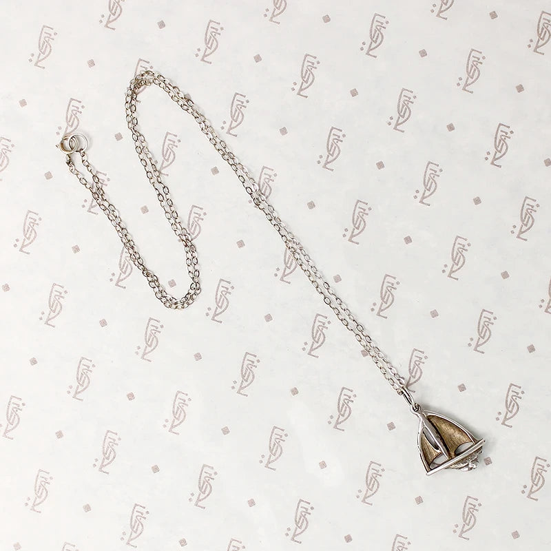 This breezy little sailboat pendant is so nicely modeled, she almost looks seaworthy. The sterling silver pendant hangs on a modern recycled sterling silver cable chain. Circa 1950.
