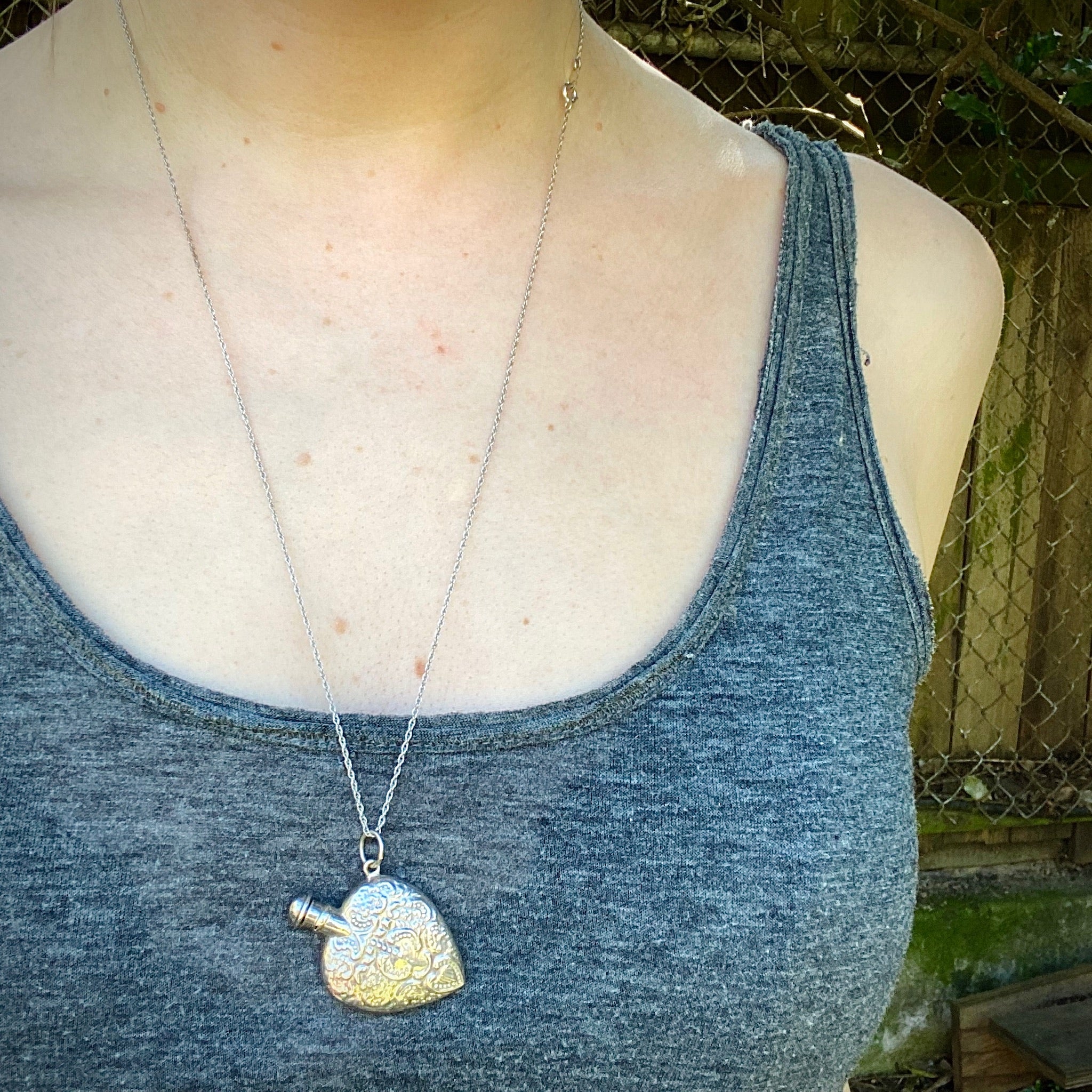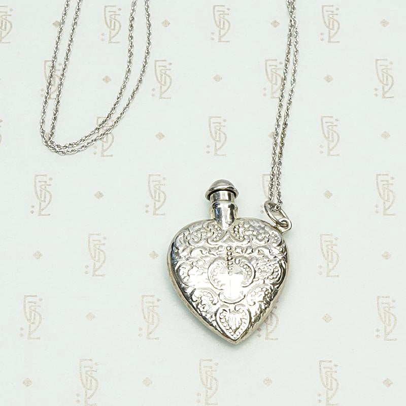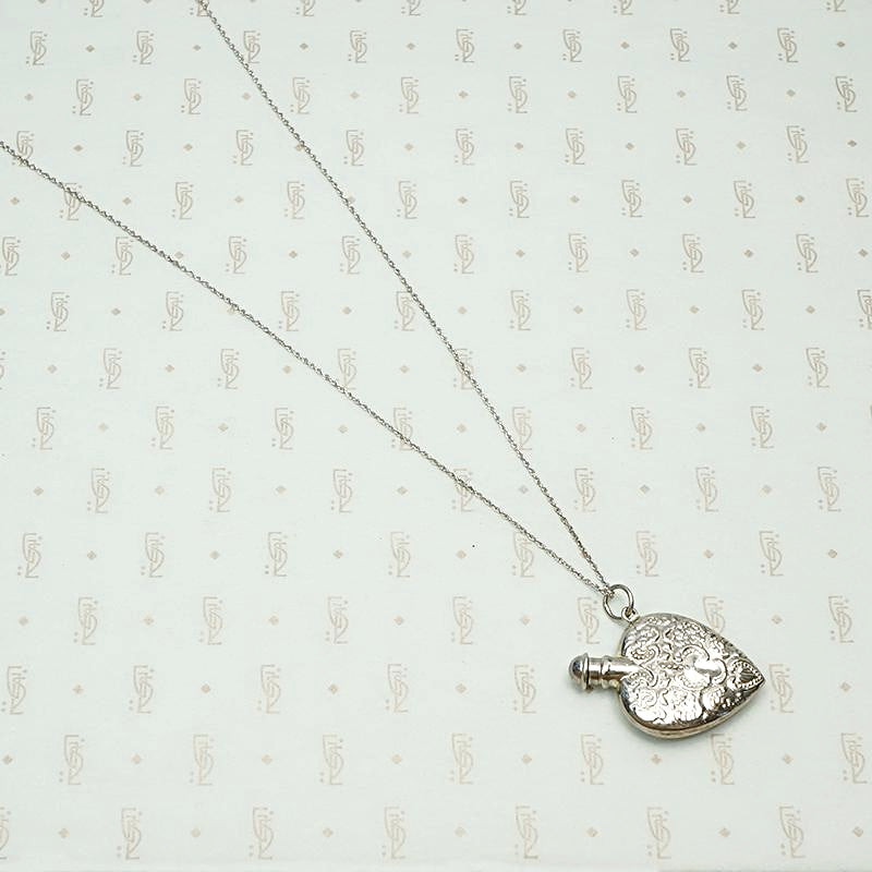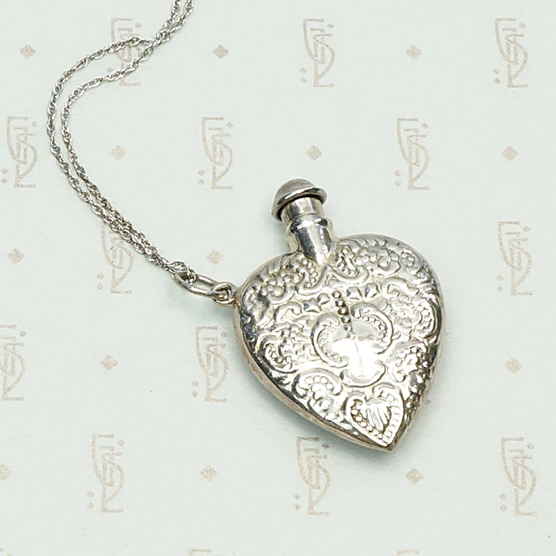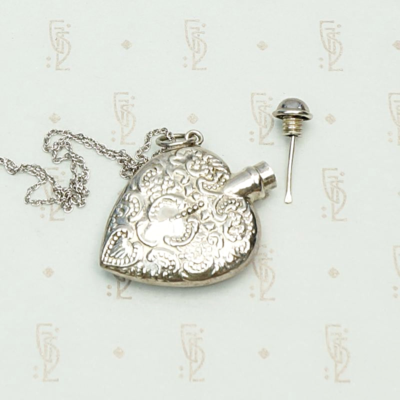 Such a pretty vintage Victorian Revival perfume bottle necklace. The heart-shaped sterling silver bottle is embellished with a romantic design that reminds us of an old fashioned Valentine. It hangs from its vintage rope chain at a fun, jaunty angle. The perfume applicator is integrated into the bottle's cap. Clean, functional and ready for your favorite scent. This pendant would also look fantastic on one of our Ancient Influences married chains. Circa 1980.