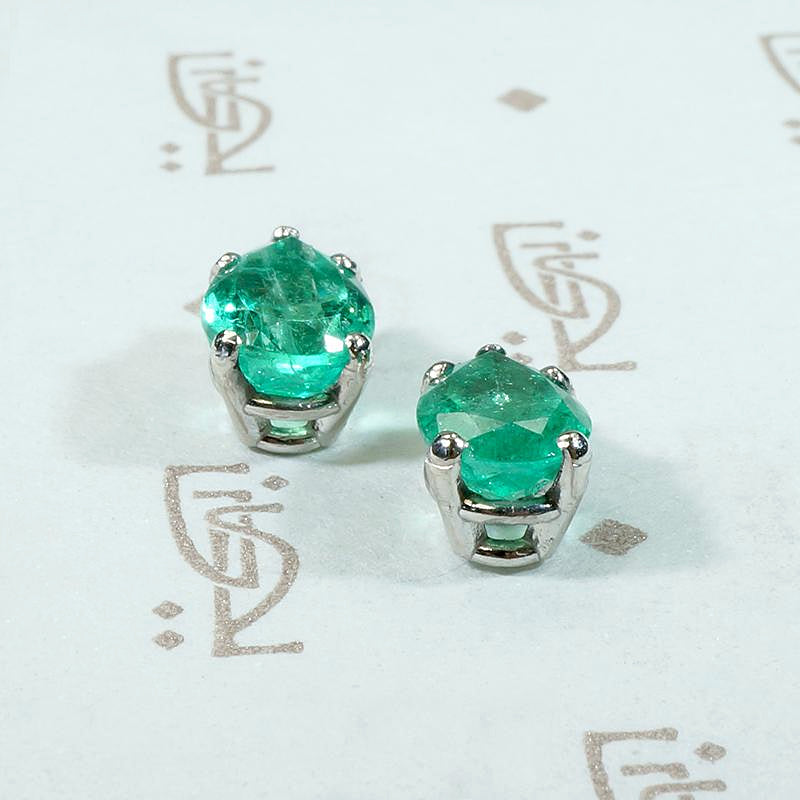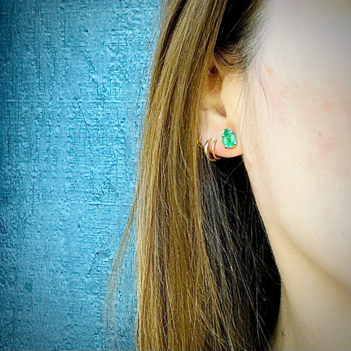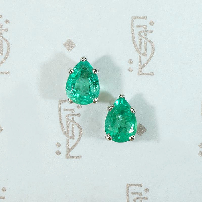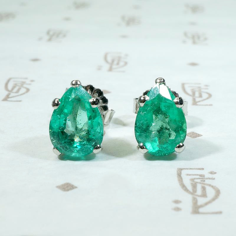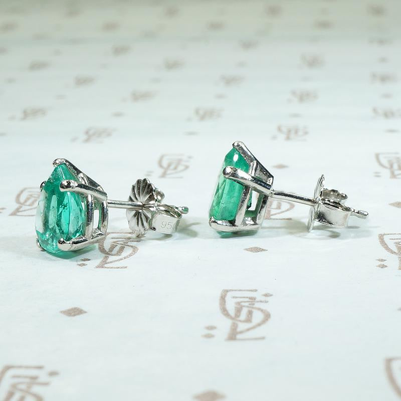 Dreamy green, like the first buds of spring. These vintage emeralds stud earrings are beautifully matched in color. The nearly-one-carat-each pear cut gems are set in recycled platinum five-prong basket settings. Finished with friction posts and tension backs for comfort and ease of wear. These vivacious studs are a classic must-have, they will bring a touch of tasteful drama to your day.