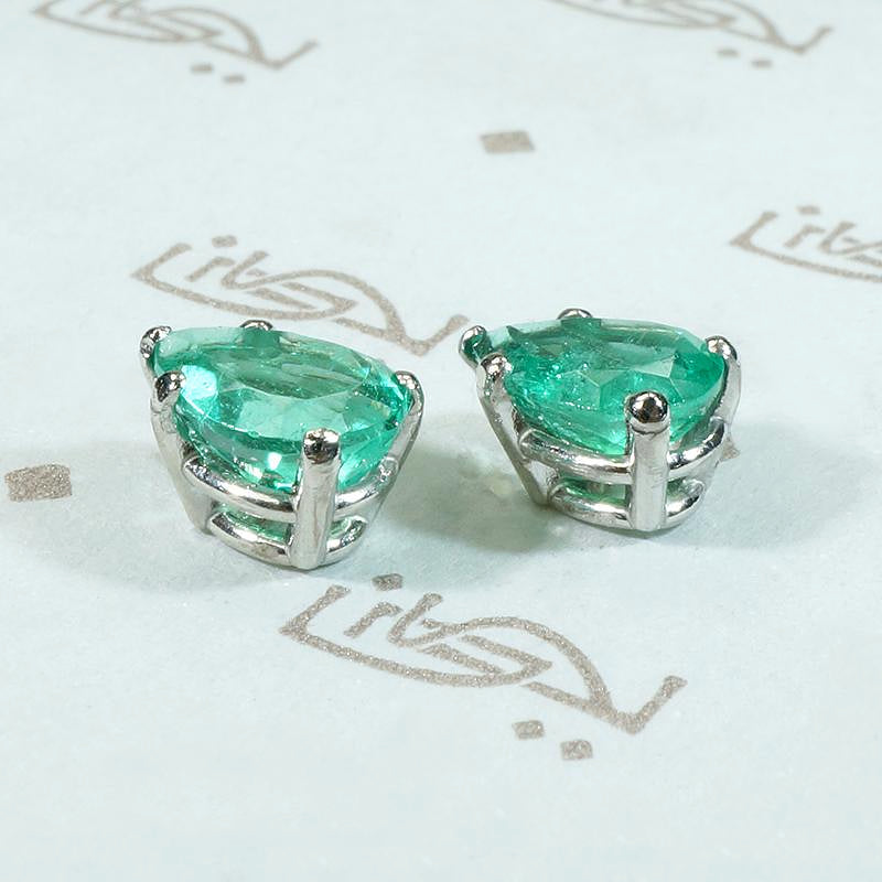 Emerald Details.....Each natural emerald is a pear shaped faceted mixed cut, with light, moderately strong, green Gem eSquare color. One weighs 1.07ct and is moderately included. The other weighs 0.87ct and is heavy included.