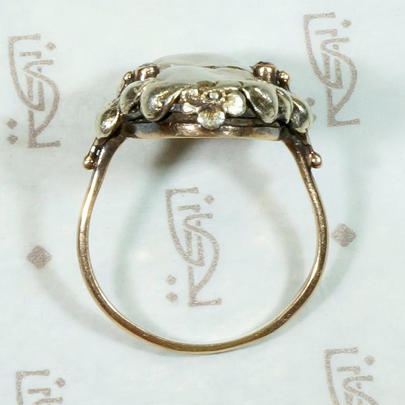 This ring may be sized up or down two sizes free of charge. Please contact us if you need this ring sized more than two sizes, it may be possible and will have a small fee. The top of the ring measures 18.8mm by 20.7mm. The band is 1.4mm wide. In Good Antique Condition. You should always expect some wear on vintage and antique jewels, we consider it part of the charm.