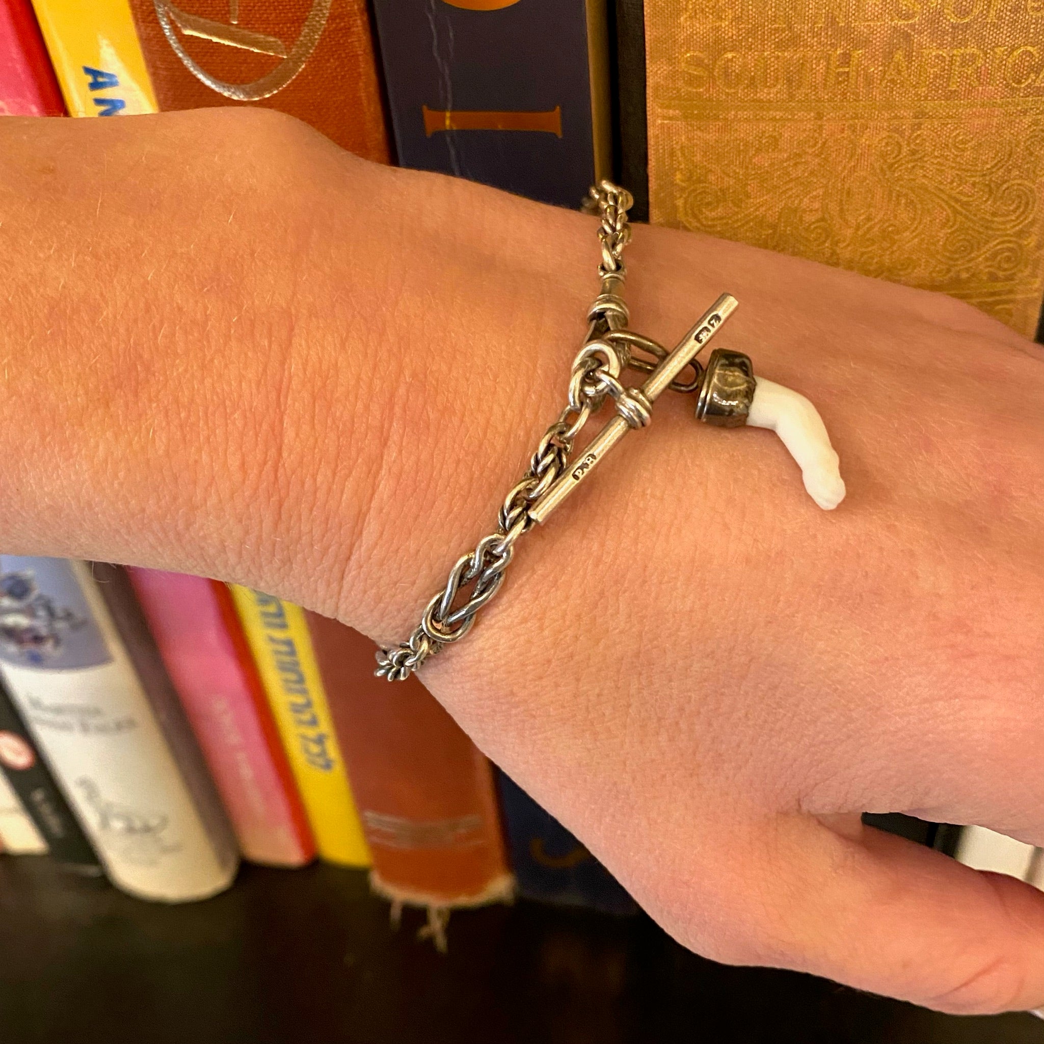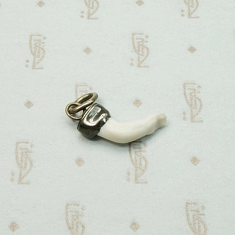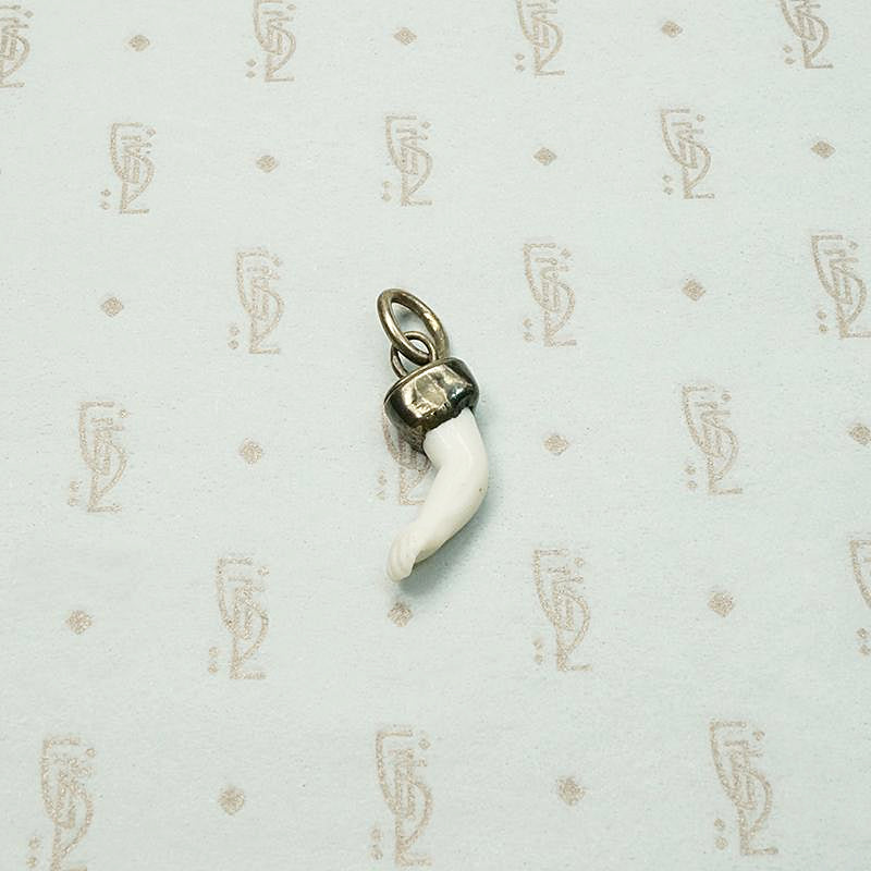 Weird and wonderful. A wee white porcelain arm has been capped in sterling silver. Was this the arm of a treasured doll, a memory of a happy childhood? Or is it a black humored joke of some kind? Say Hello, Wave Goodbye? Whatever it is, it's a little creepy and we love it. The silver cap and bale make this pendant easy to wear in many ways. Try it on one of our Ancient Influences married chains and raise your Chain Game.