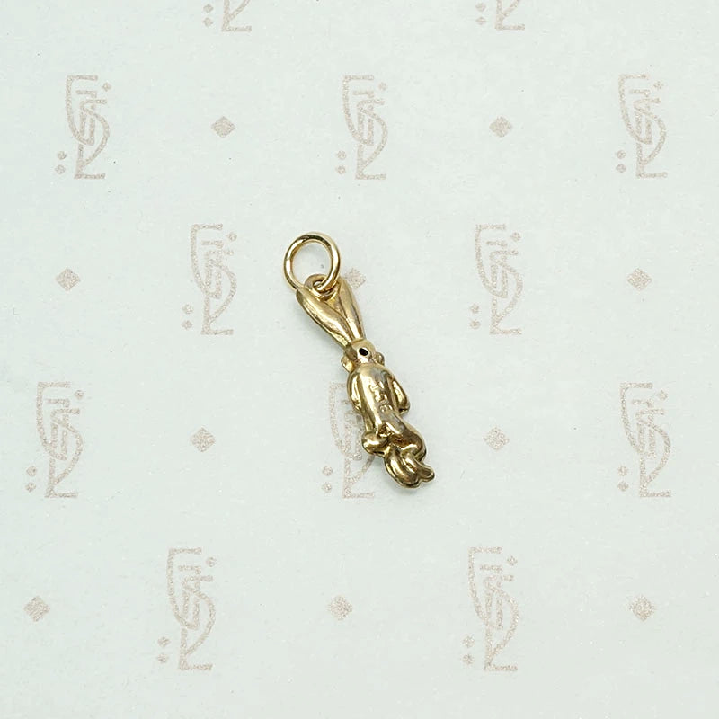 A whimsical English 9ct gold rabbit charm. He looks like a feisty character. This little guy is suspended by a gold jump ring, making it easy to hang the charm from anything you like. Circa 1940.