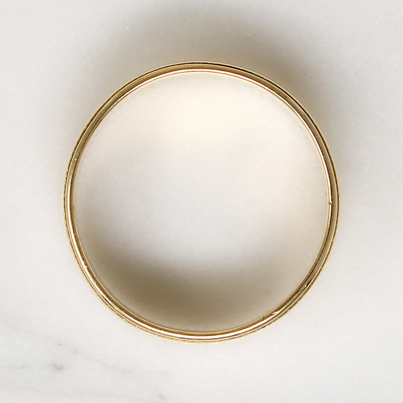 This vintage 14k gold wedding band is signed Wed-Lok. It is quite wide and rather flat, with stepped sides and an interesting engraved pattern reminiscent of a Spiro-Graph. The interior is marked "14k Wed-Lock" in a pretty script. A stylish band in a larger size is always a happy find. Circa 1960.