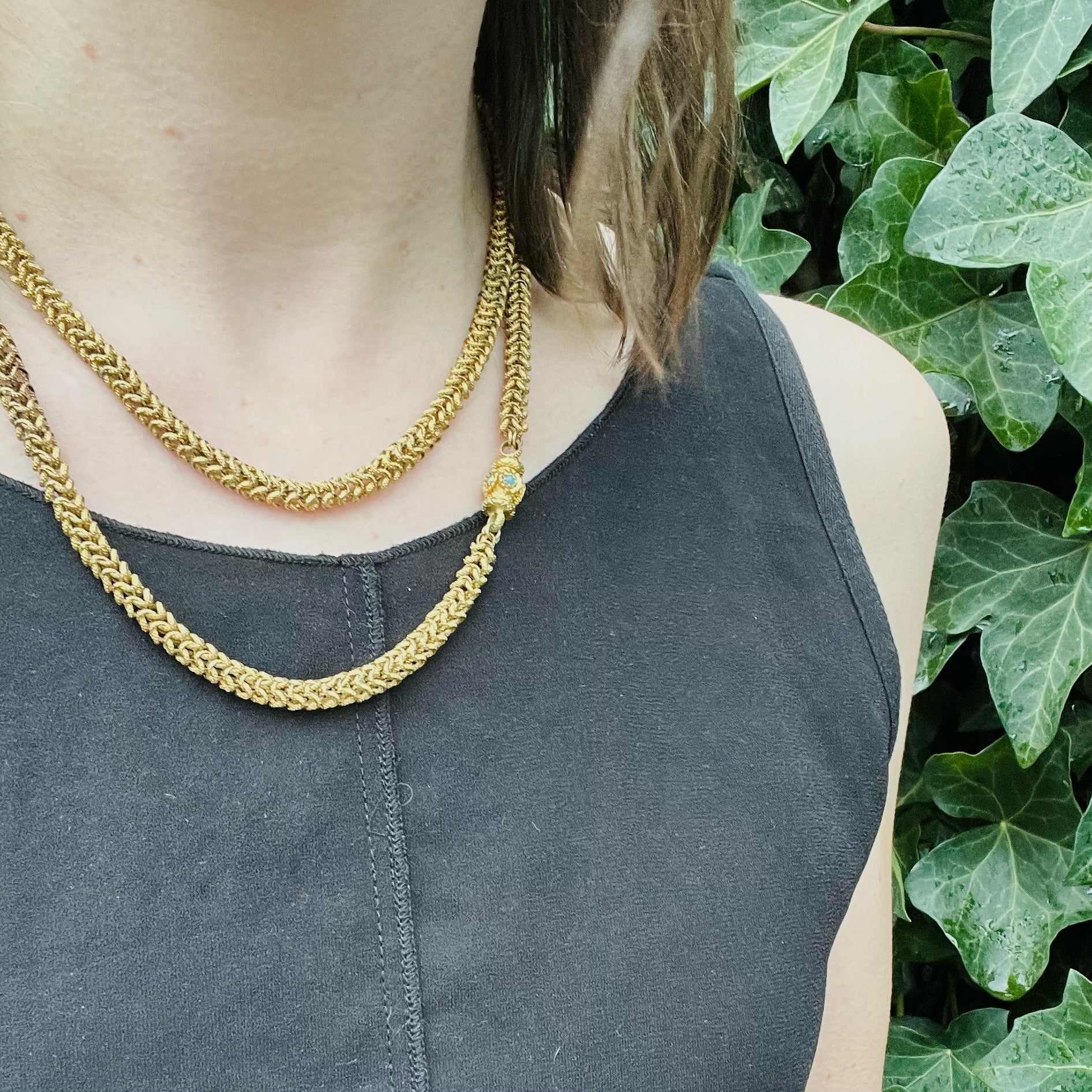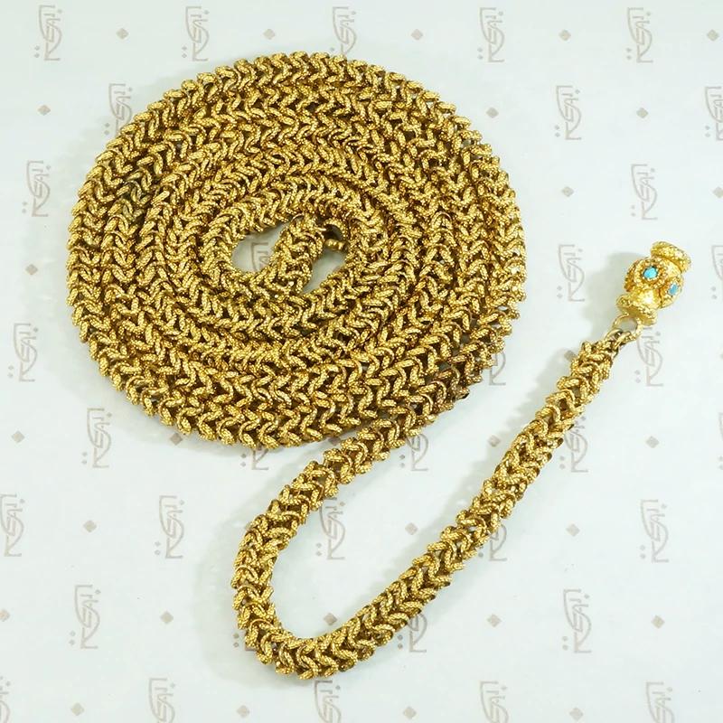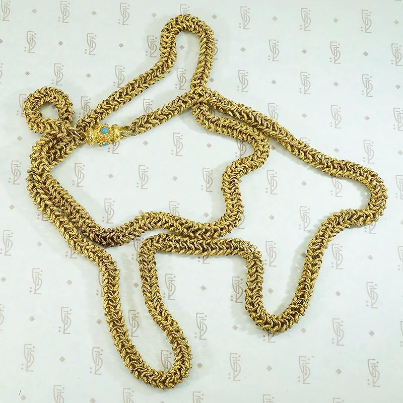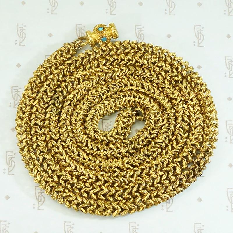 This wonderful mid 19th Century Pinchbeck chain is composed of thousands of engraved links, finished with a decorative clasp. The long mesh chain is marvelously supple with an appealing texture. The ornate barrel clasp is set with four tiny turquoise-colored glass gems. Circa 1865.