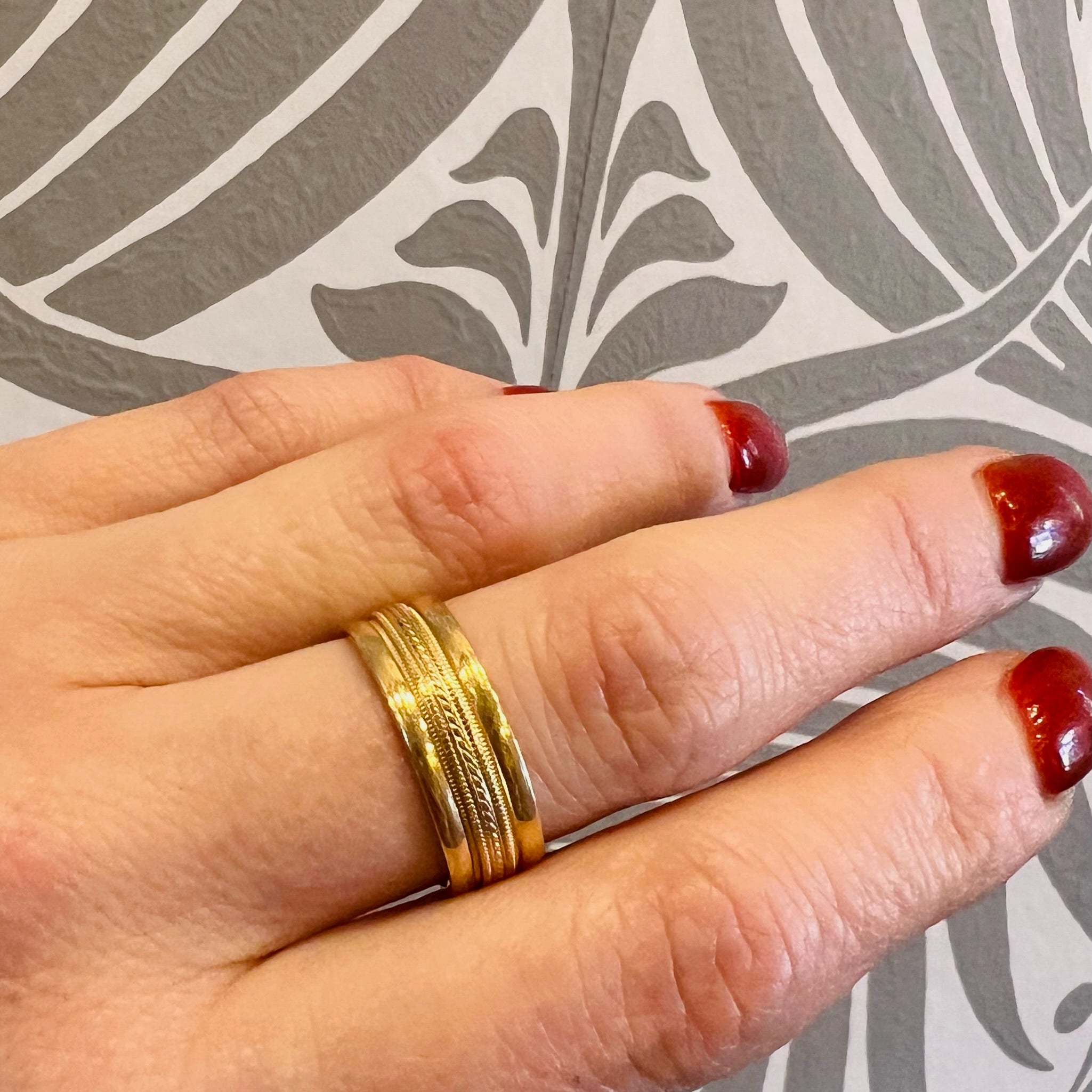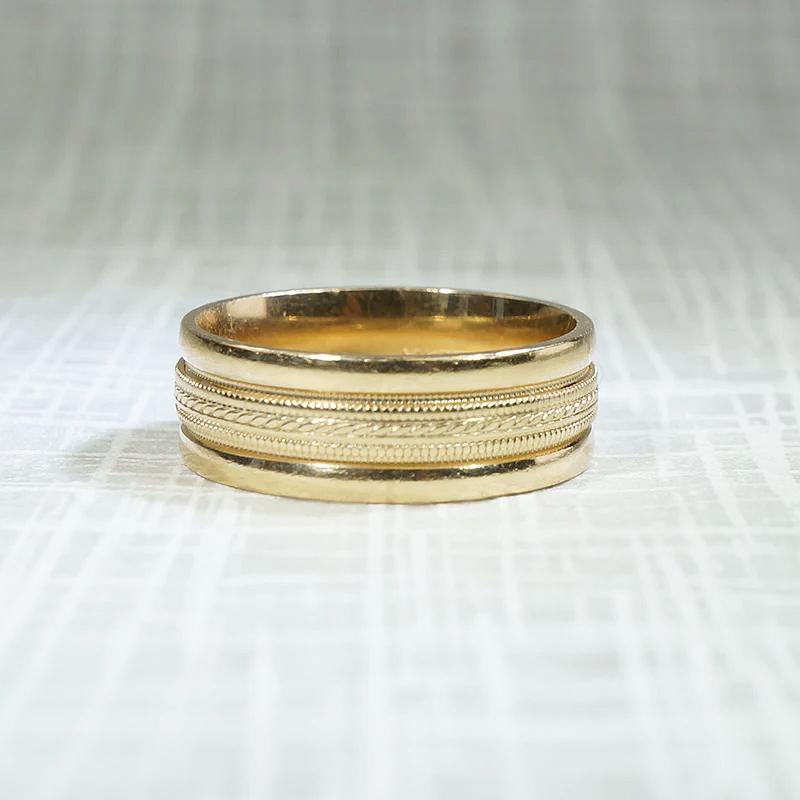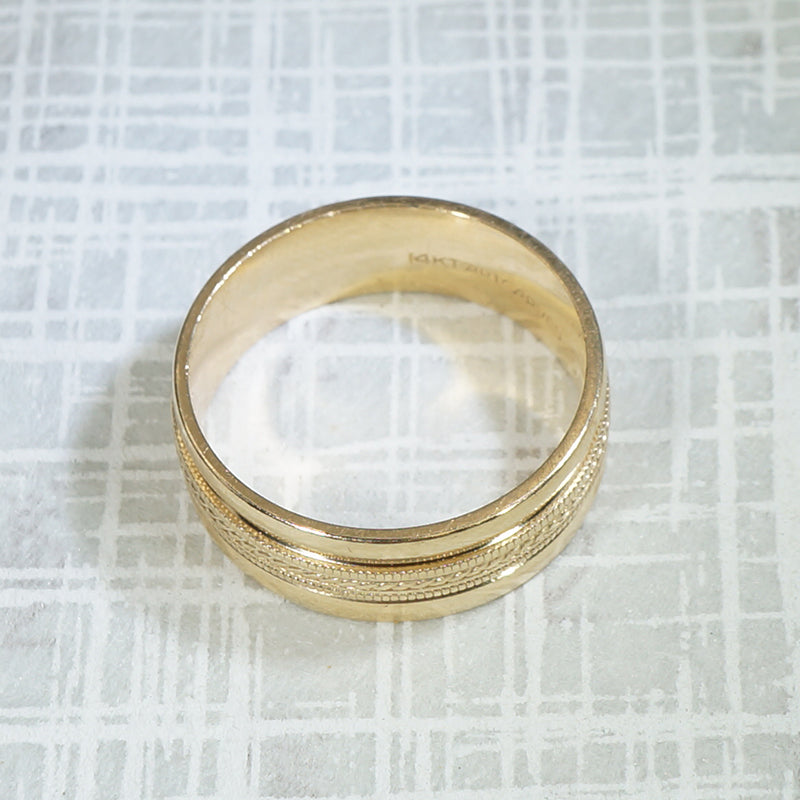 This is a wonderful vintage wedding band from the popular American jewelry maker ArtCarved. The substantial 14k yellow gold band is ringed with a delicate pattern engraved between raised and highly polished edges. The interior of the band is stamped "ARTCARVED". Circa 1950.