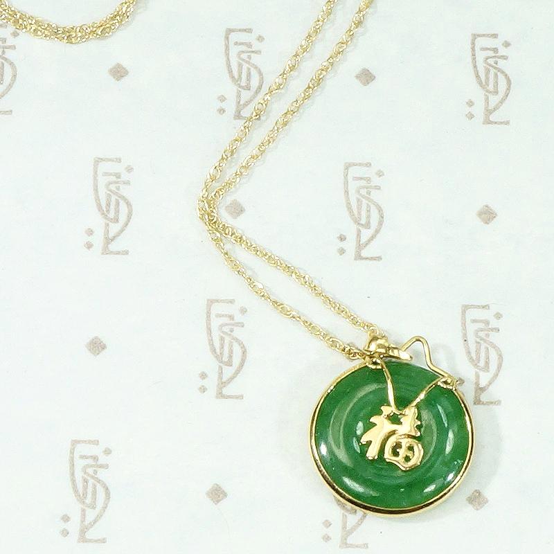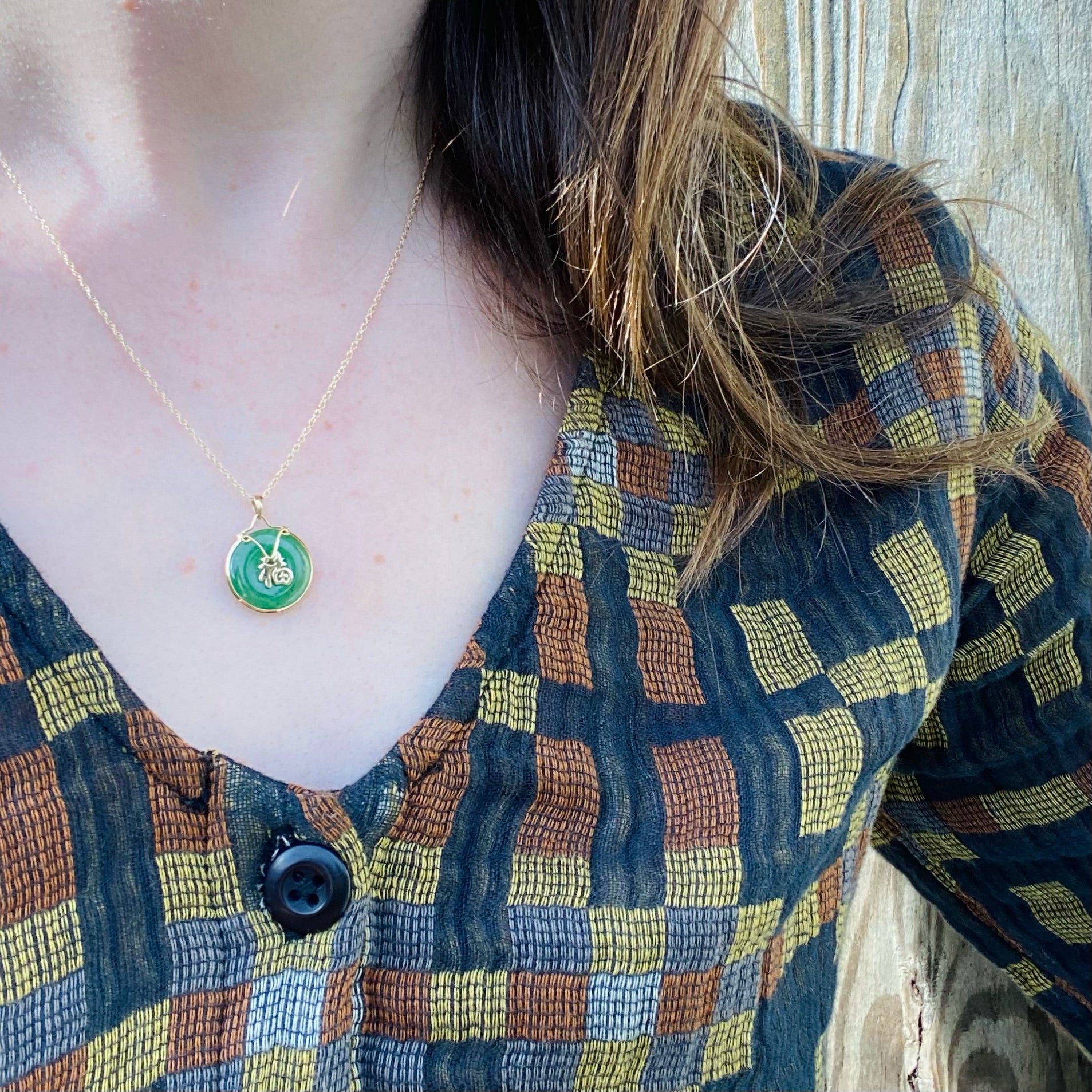 Translucent and the most fabulous shade of green, this chubby circle of jade is held in an 18k gold frame with the character for happiness at its center. The pendant is suspended from a new 14k chain made of recycled gold. Circa 1950.