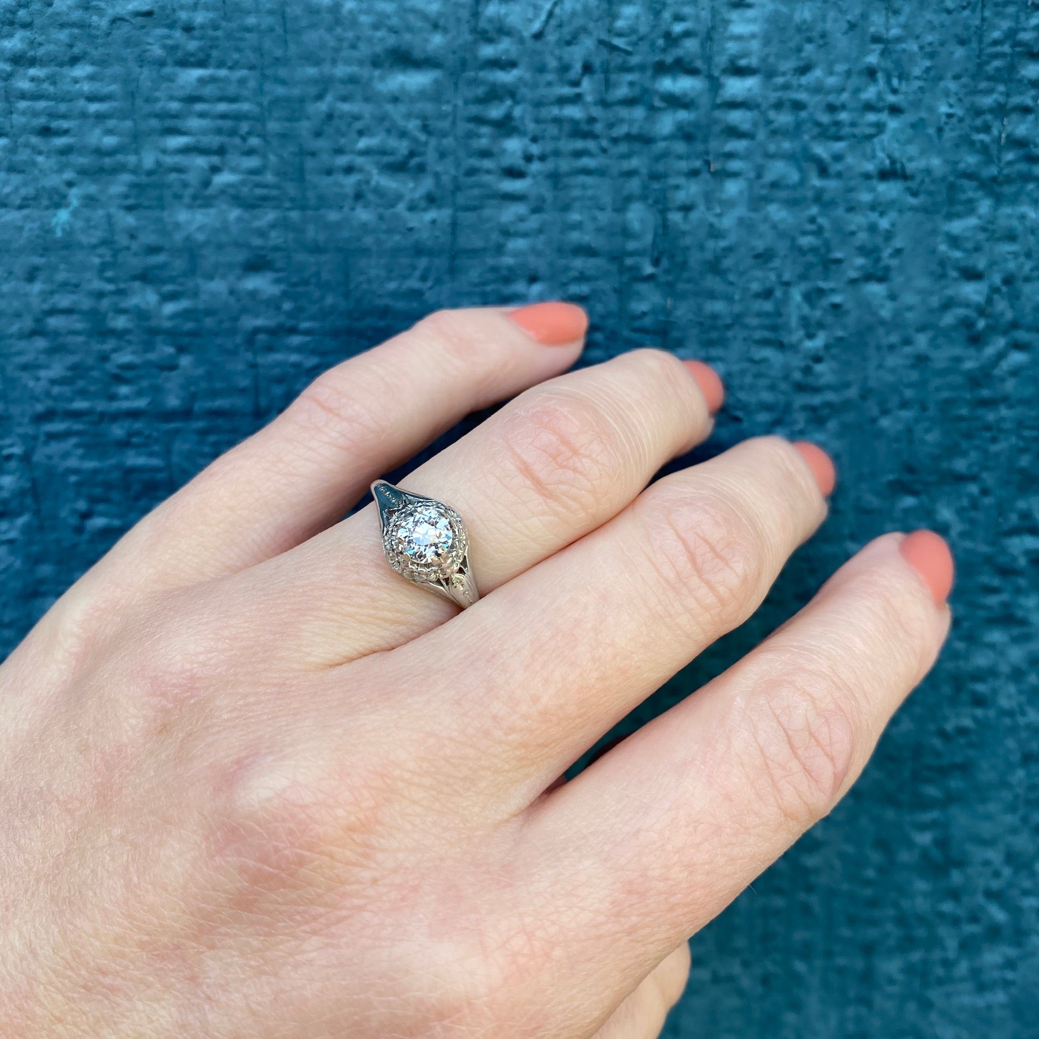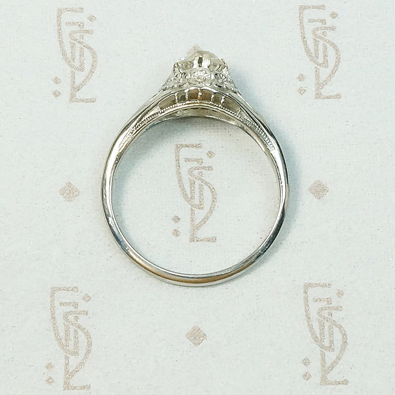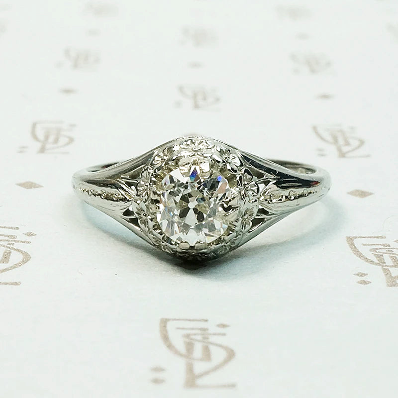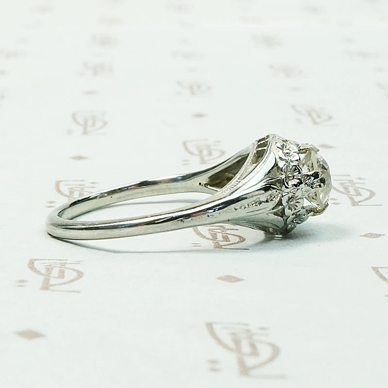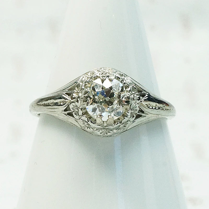 A wonderful old mine cushion cut diamond is nestled at the center of a wreath of white gold blossoms. The diamond is set in fancy double prongs. The sides and shoulders of the 18k white gold ring have beautiful filigree open work details. This romantic Art Deco engagement ring is perfect for your favorite vintage lover. Circa 1920.