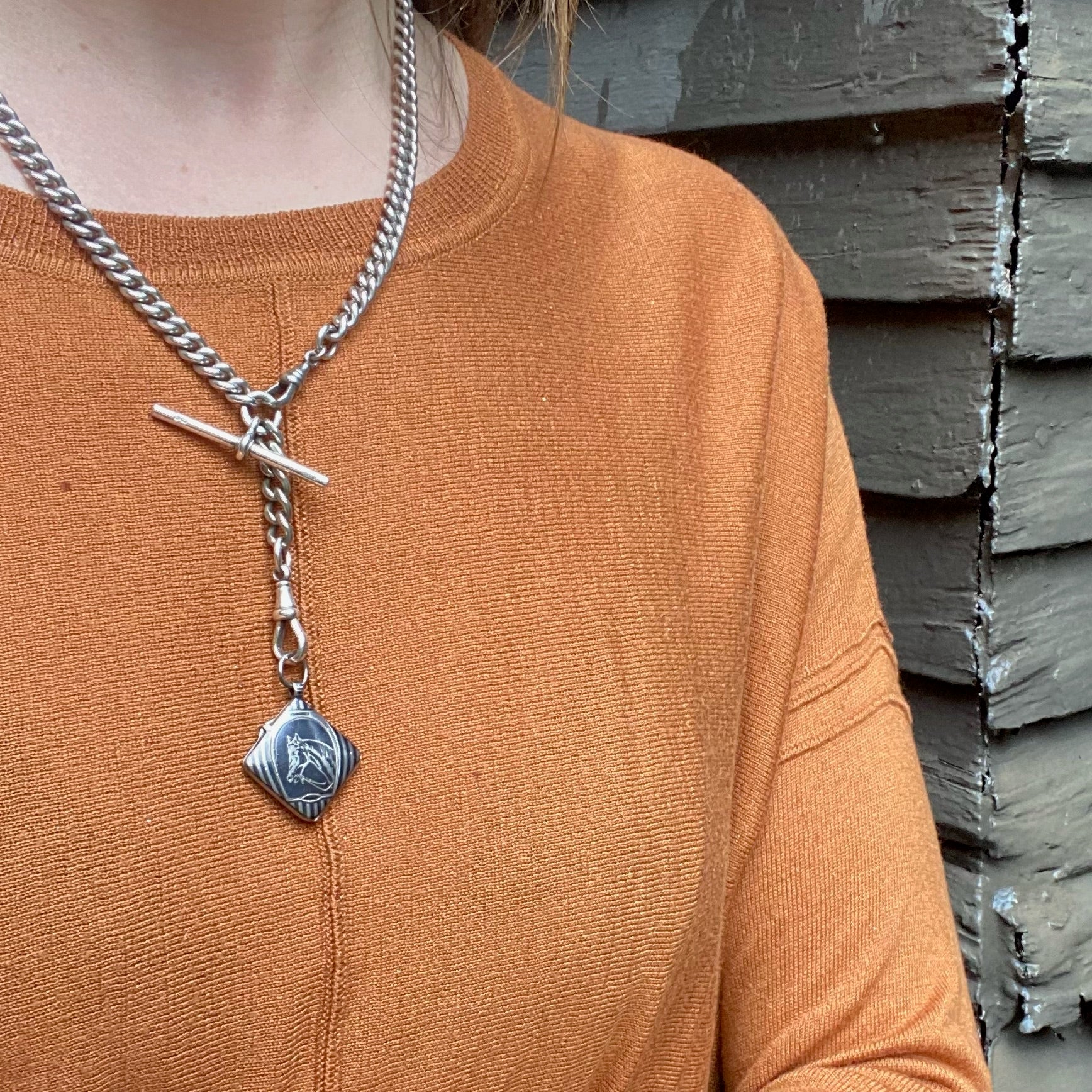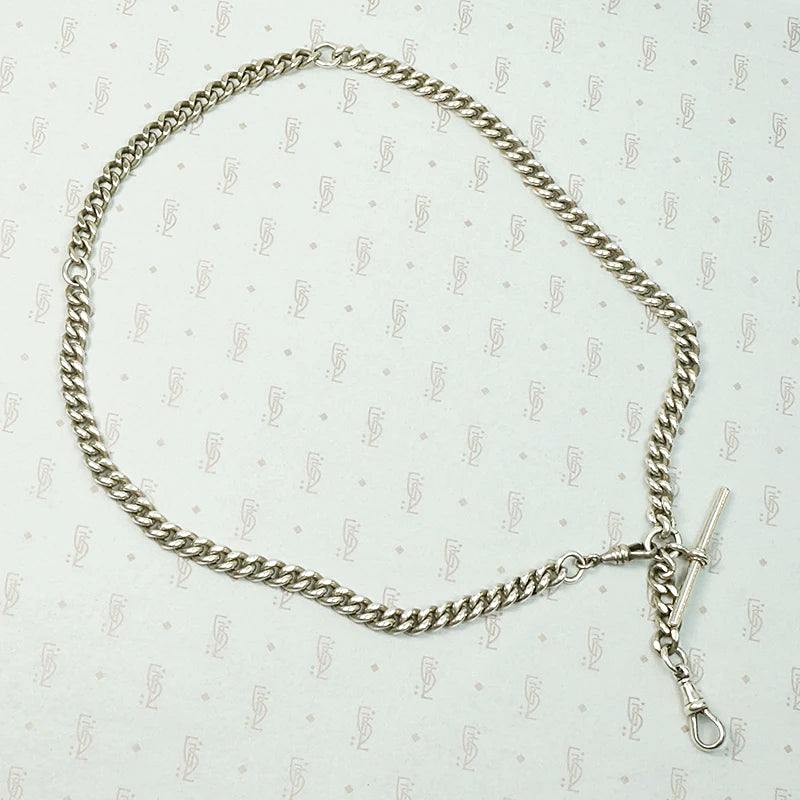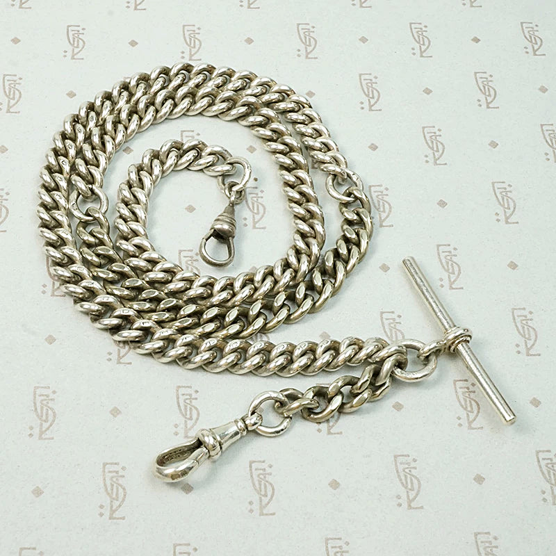 This sterling silver married chain is composed of chunky, slinky English curb chain. Segments of the Edwardian chain are linked, then clasped at the front with a watch hook. A sterling hook and t-bar hang from its bottommost ring. The piece is hallmarked for Birmingham and the years 1914-15. The double hook makes the necklace versatile, it can be worn many ways and you can hang all your favorite bits and bobs from either hook. Raise your Chain Game.