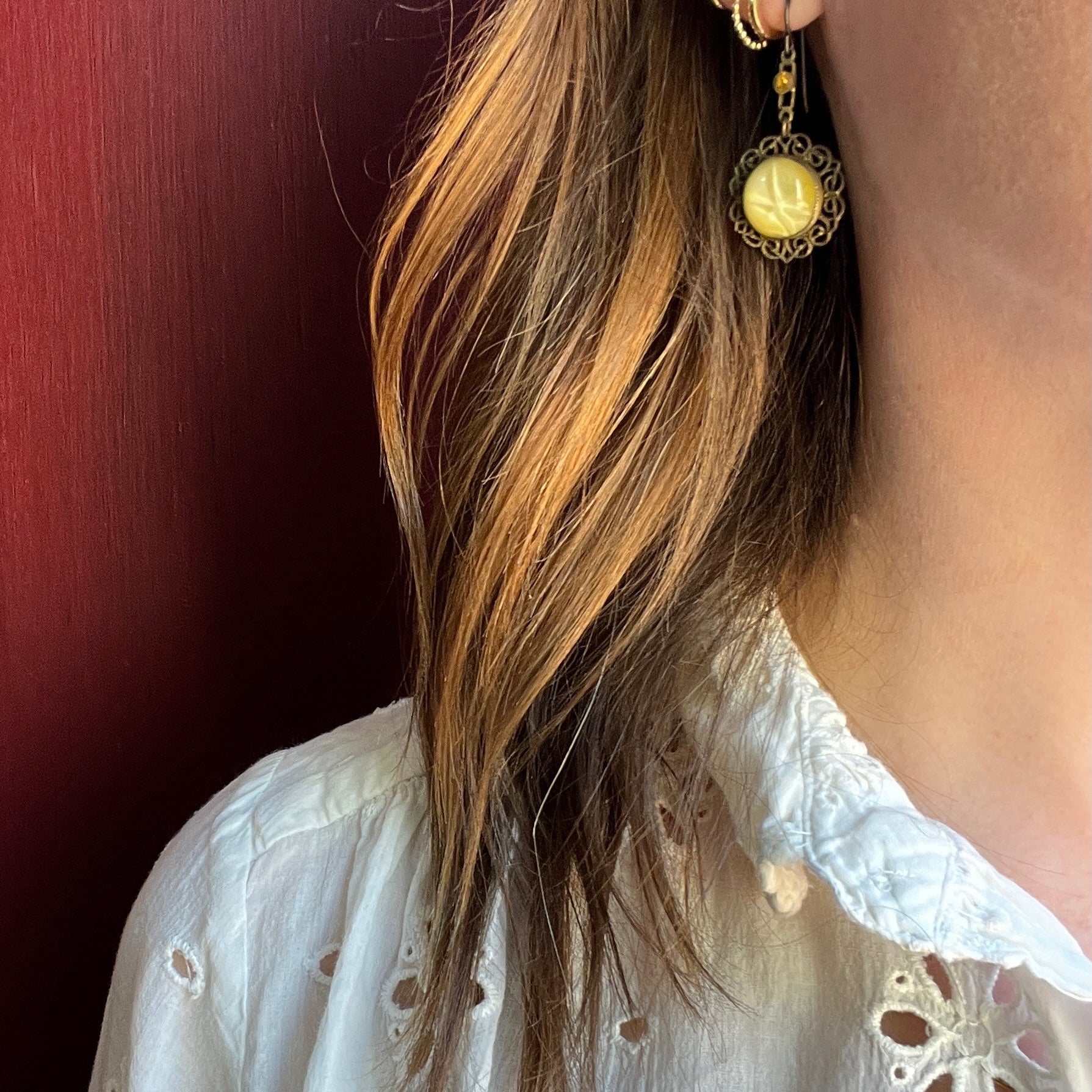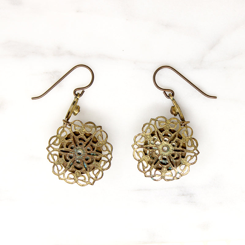 Early 20th-century brass and glass jewelry is a delightful genre, so glamorous and creative with an accessible price point. These drop earrings are a fun example of the style, with gorgeous art glass cabochons and elaborate brass filigree. The art glass is pale yellow with interesting optical effects that recall star sapphires. The glass gems are bezel set on discs of lacy brass with engraved details. Rectangular links connect the drops to the tops, each set with a single orange rhinestone. The earring tops are classic French wires. Circa 1930.