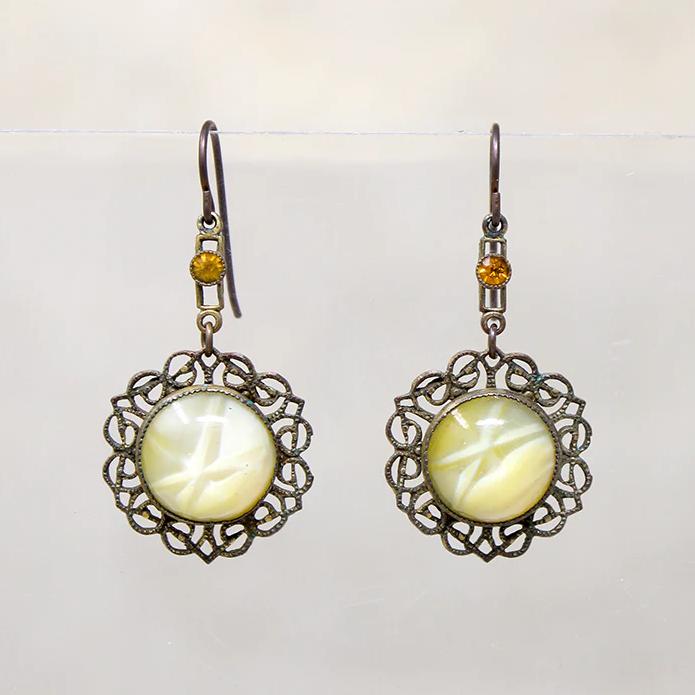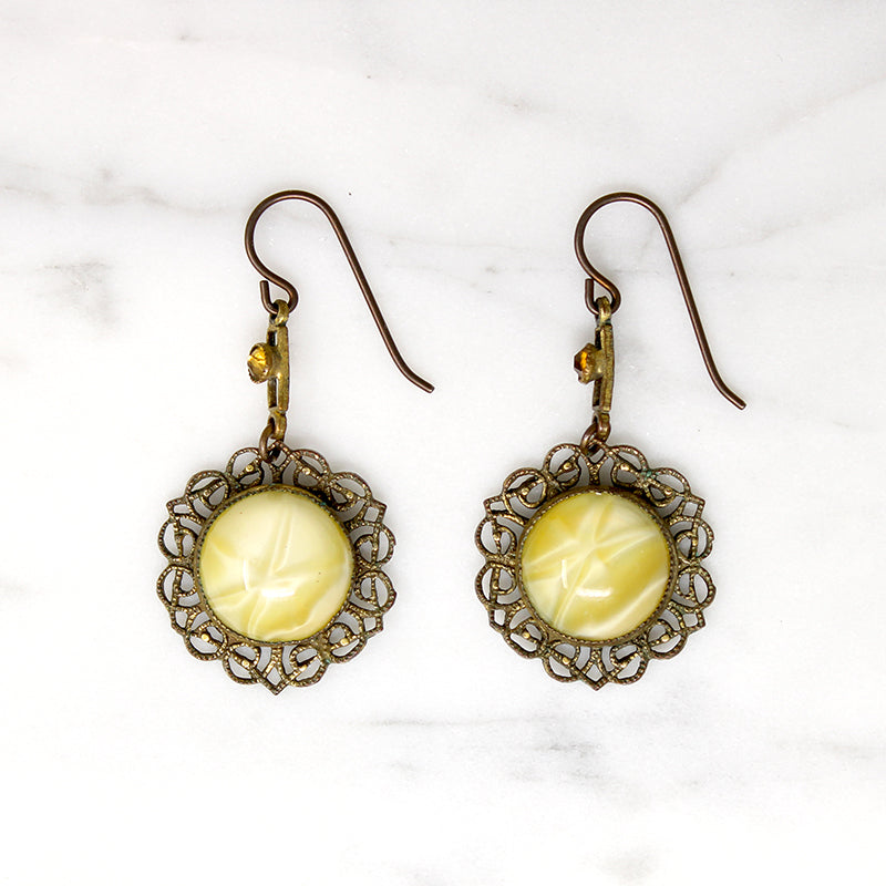 Yellow Art Glass & Brass Filigree Drop Earrings